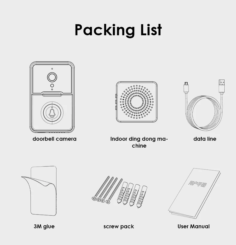 1 * Камера дверного звонка, 1 * Внутренняя машина Ding Dong, 1 * клейкая наклейка, 4 * винт, 1 * Руководство пользователя