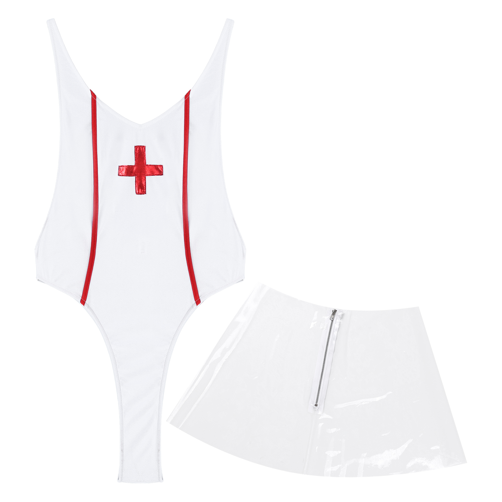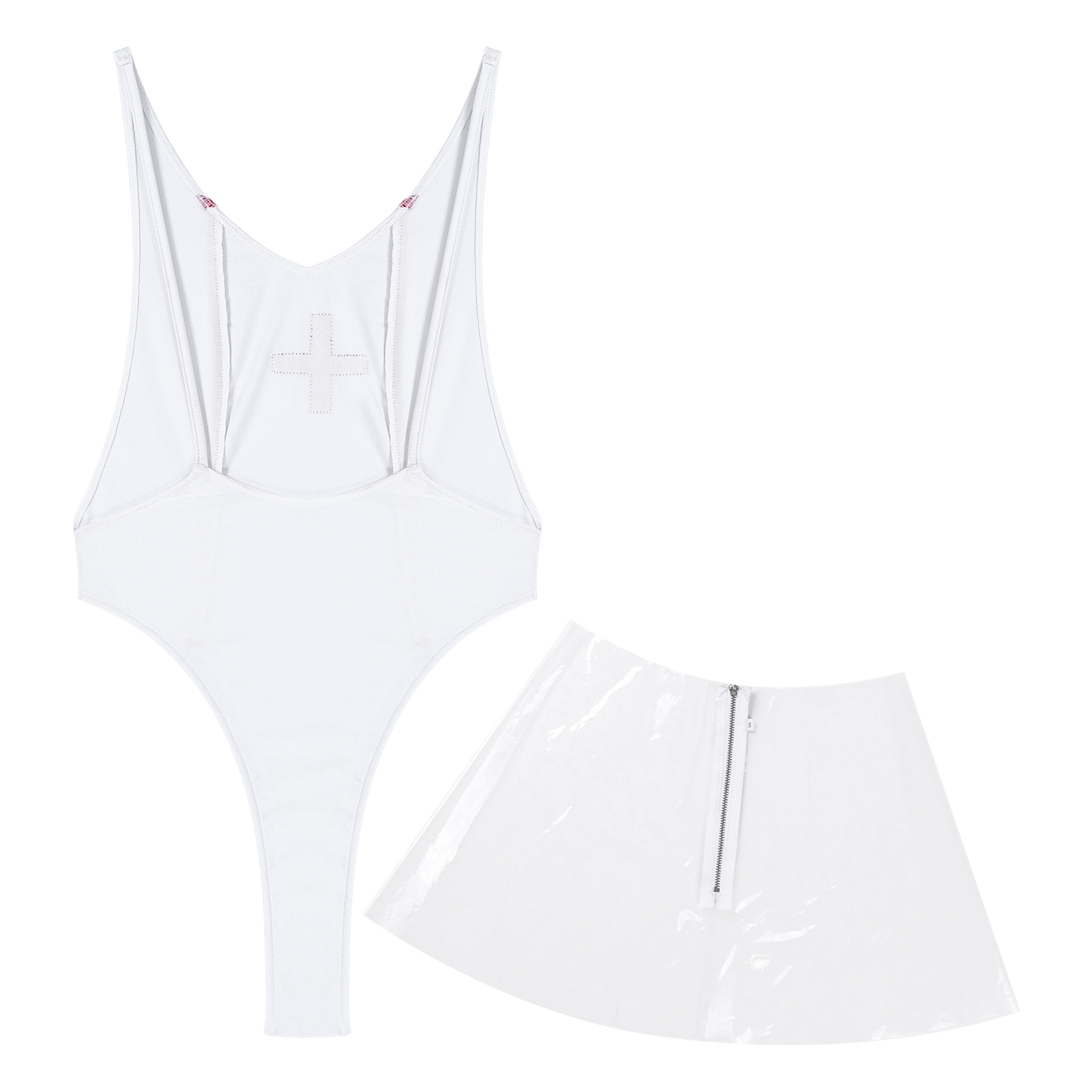 Женский костюм медсестры для ролевых игр, боди с v-образным вырезом и открытой спиной с прозрачной юбкой.