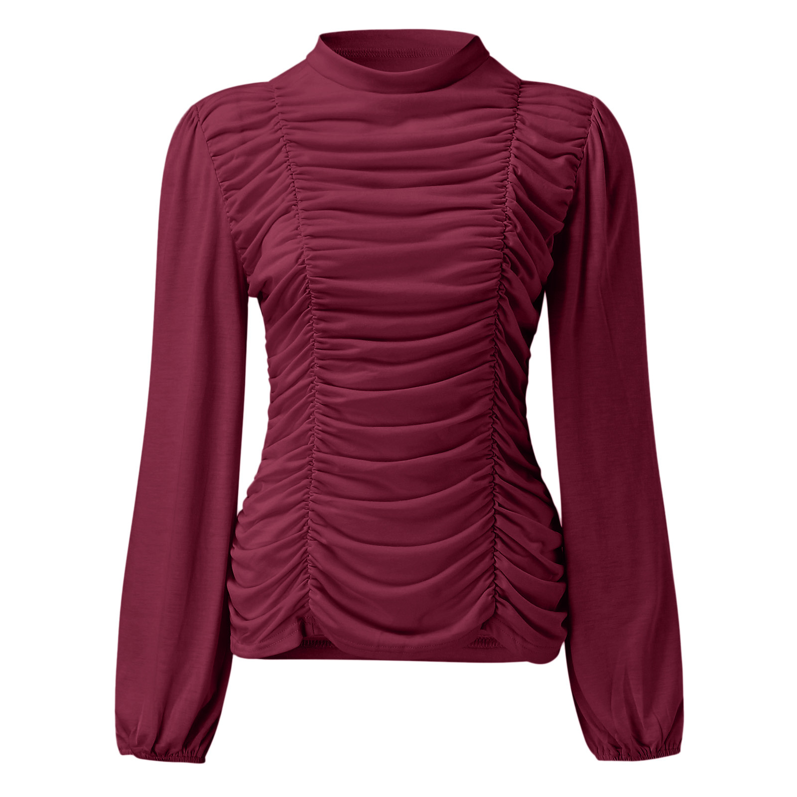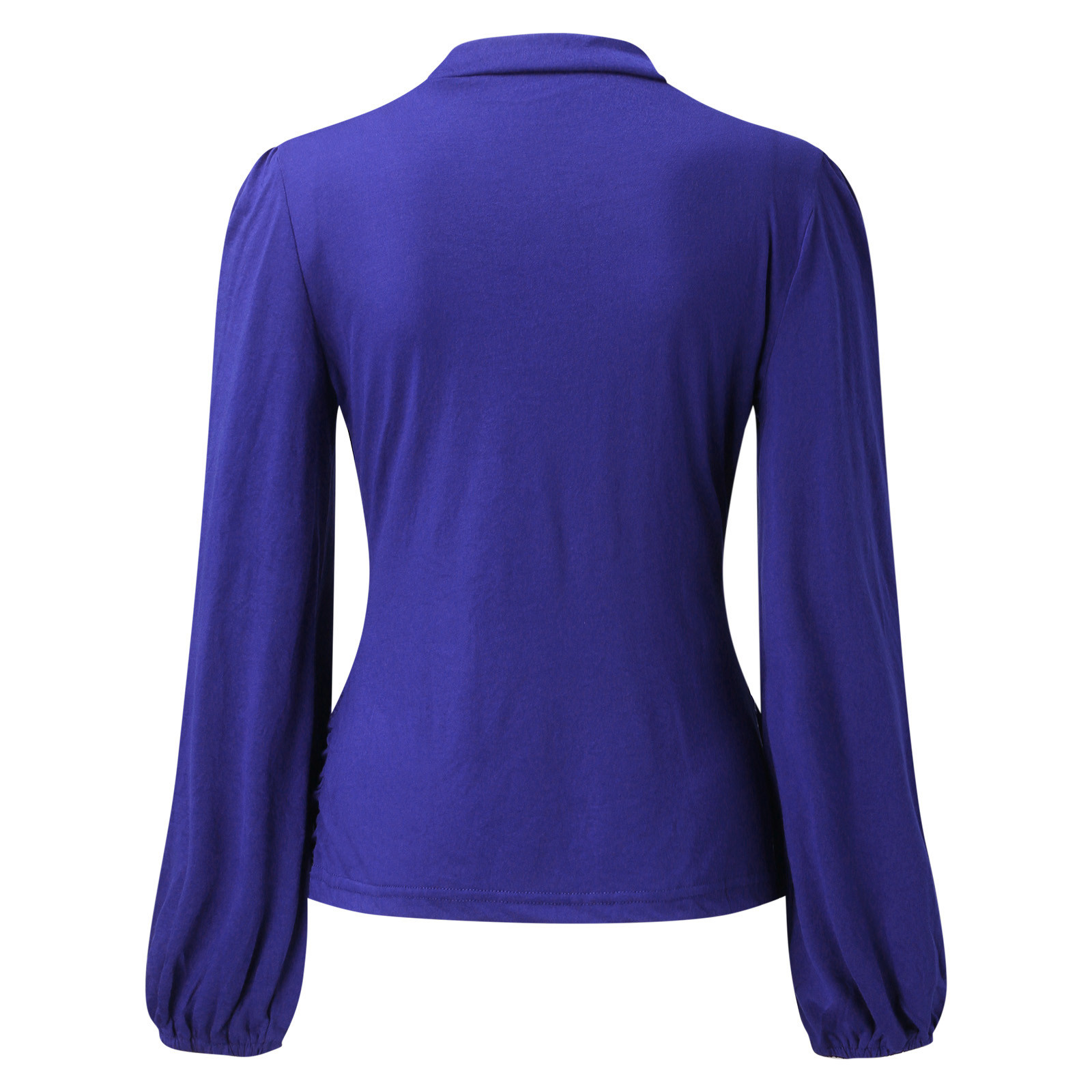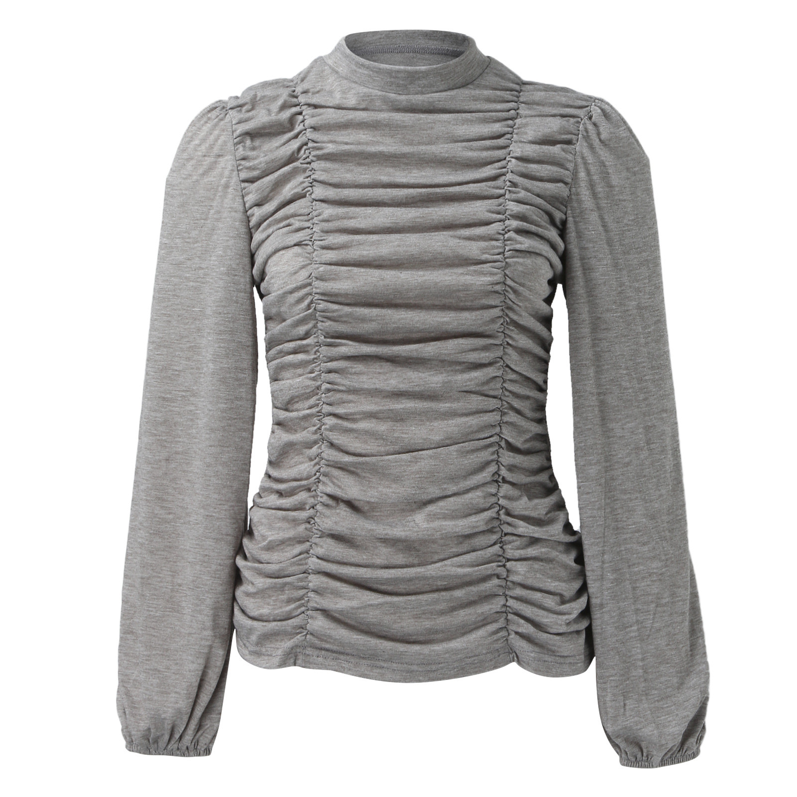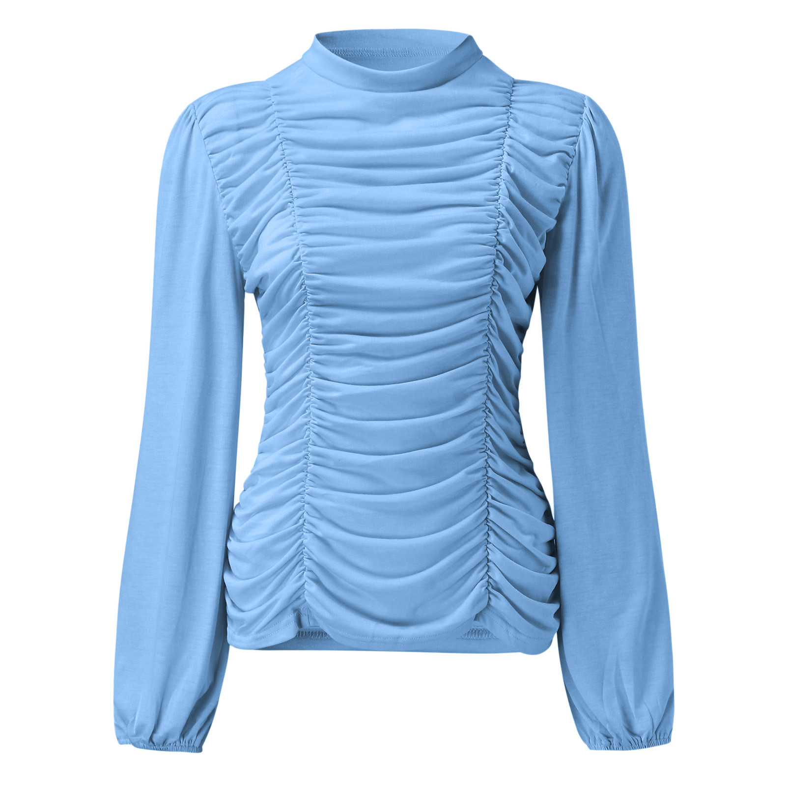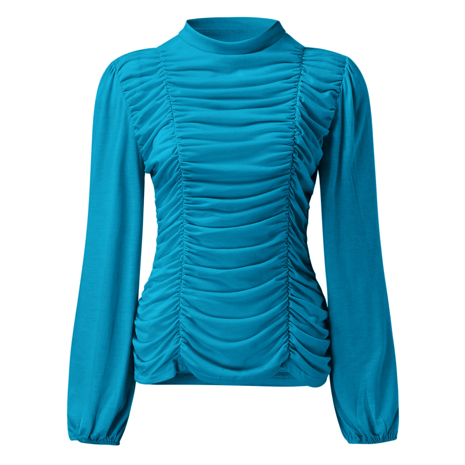 Обычная длина, сплошной цвет. Рубашка с длинными рукавами и круглым вырезом, с оборками спереди, сделает вас более красивым, стильным, сексуальным и элегантным.
