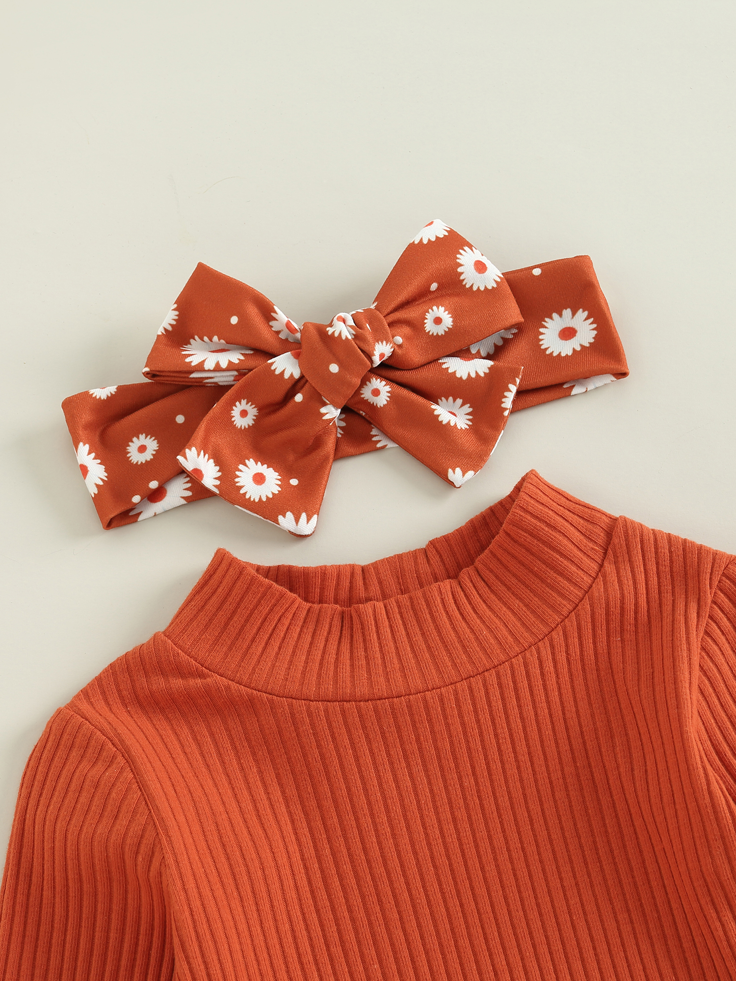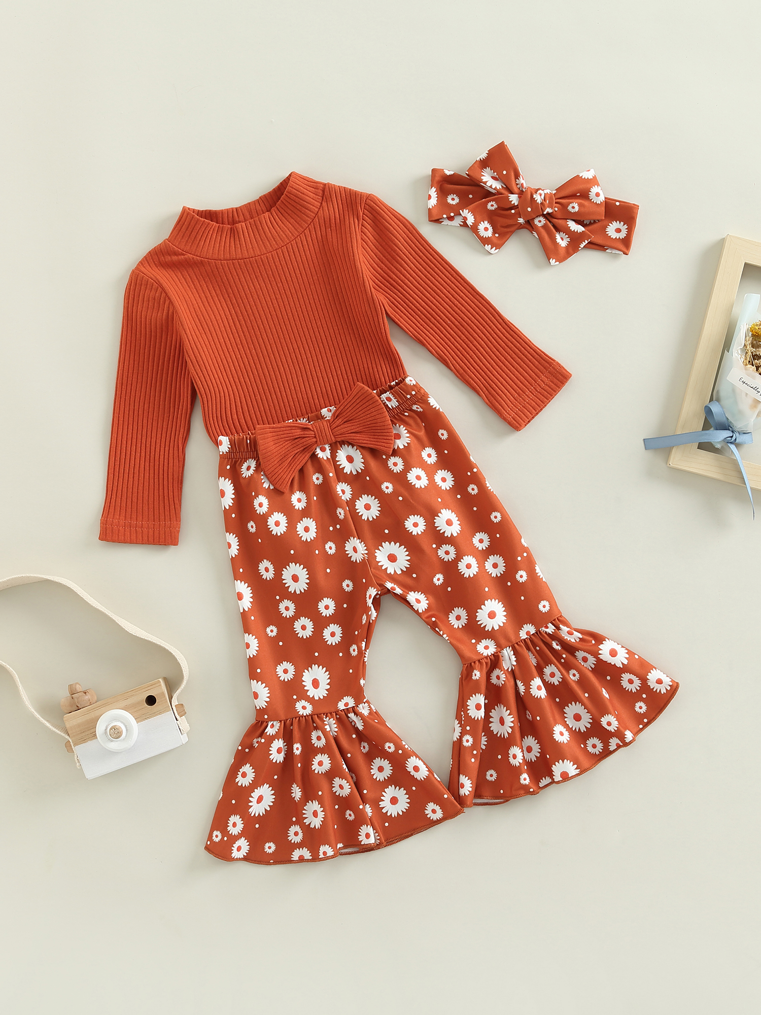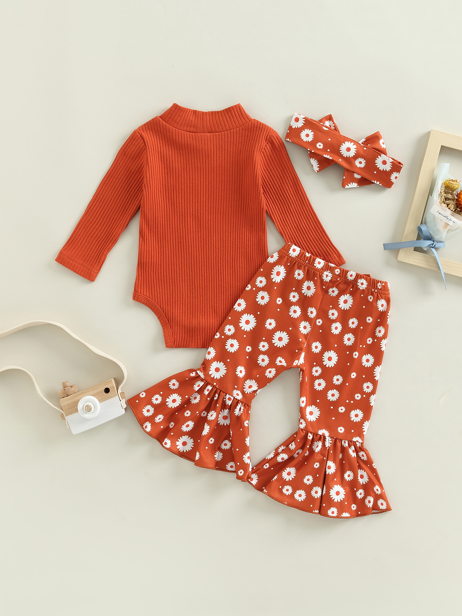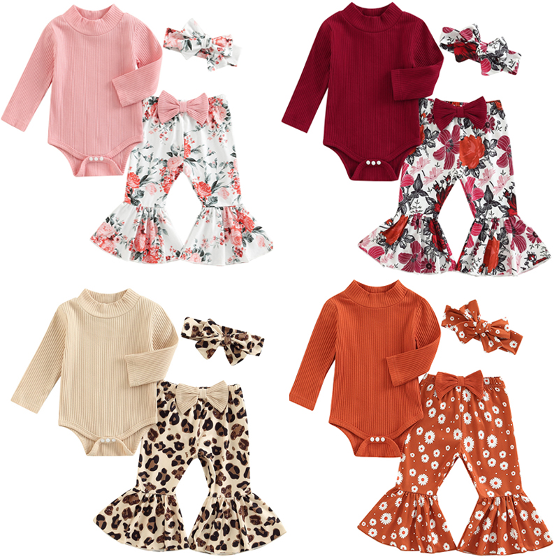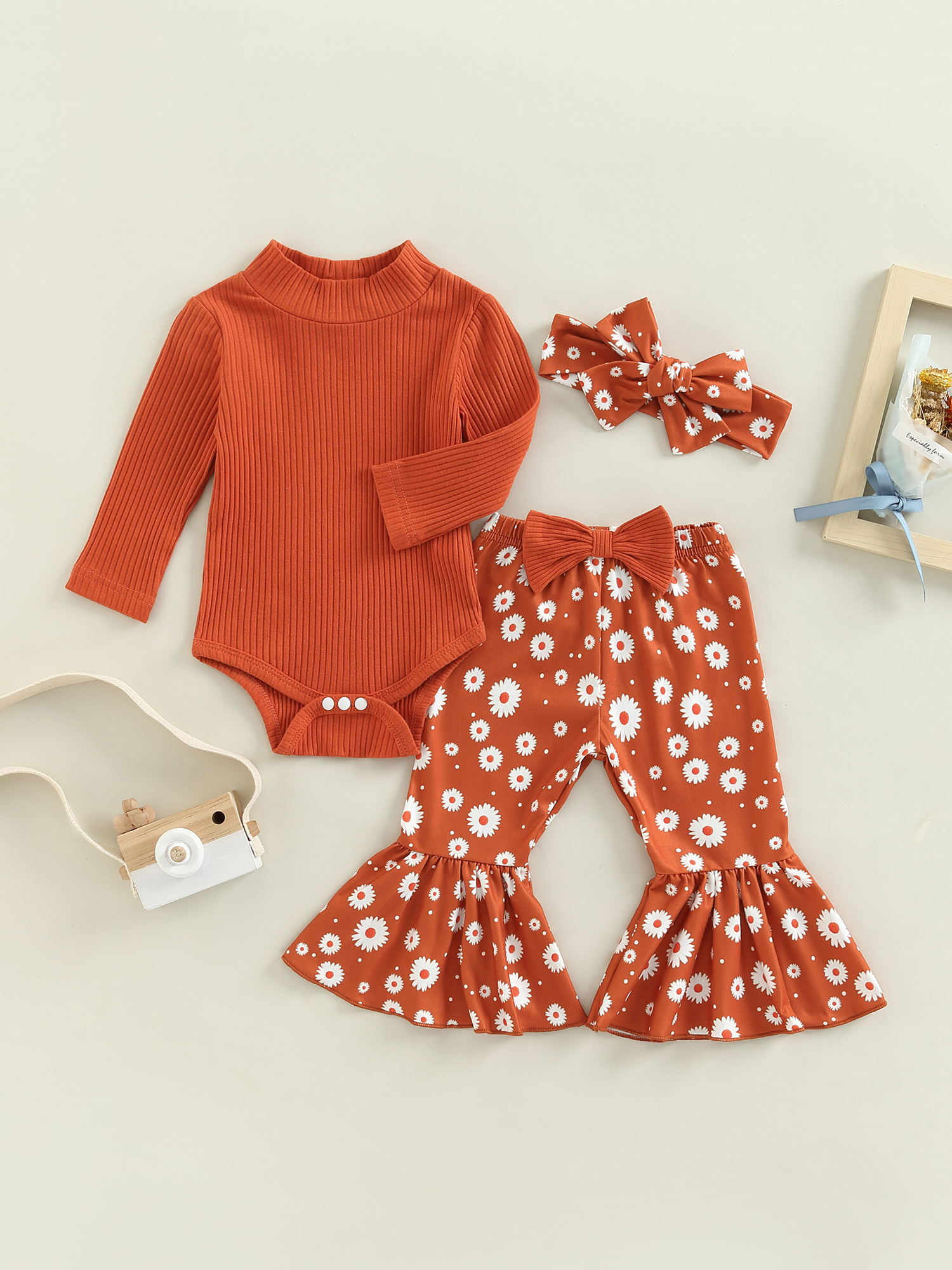 Комплект из 3 предметов для маленьких девочек однотонный трикотажный комбинезон с высоким воротником и длинными рукавами + расклешенные штаны с цветочным принтом + повязка на голову