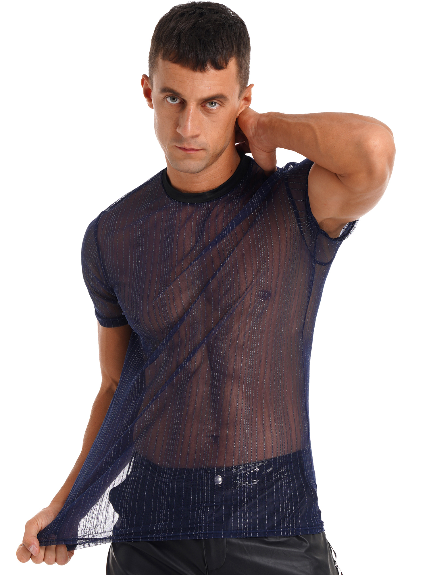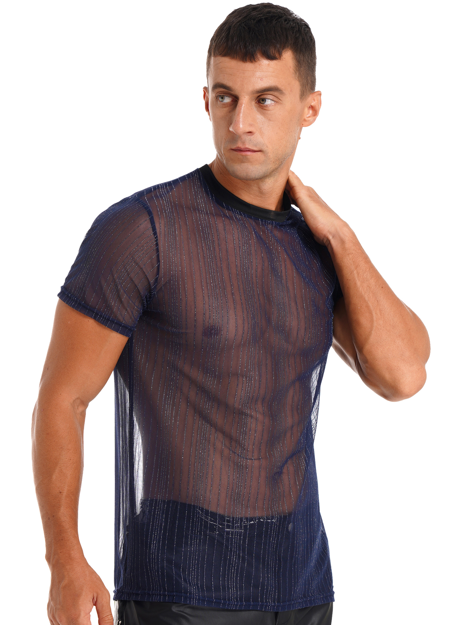 Мужская модная блестящая полосатая футболка с коротким рукавом, прозрачная Сетчатая футболка.