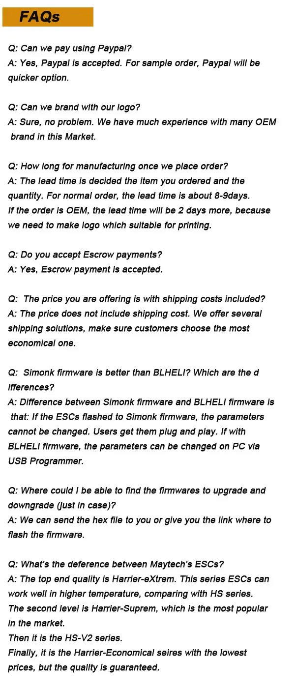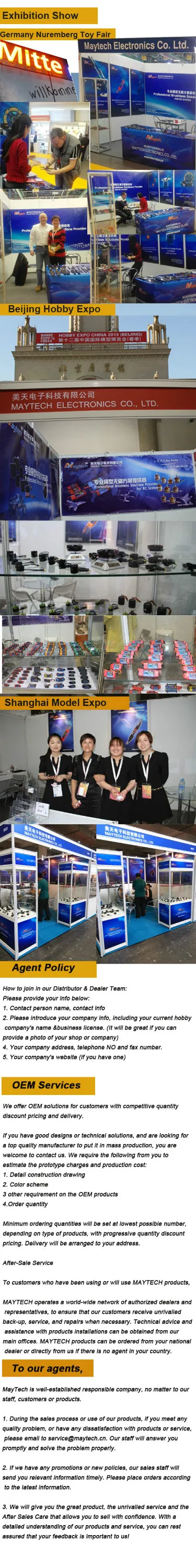 Maytech Electronics Co., Ltd.Занимается проектированием и производством бесщеточных ESCs, бесщеточных двигателей, пропеллеров, аналоговых и цифровых сервоприводов для радиоуправляемых моделей, таких как радиоуправляемые самолеты, вертолеты, лодки, автомобили и Truggies.