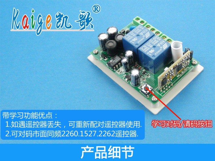 7>. Сопряжение кода типа обучения: вы можете узнать сопряжение кода с той же частотой, что и 2 кнопки дистанционного управления. (Во время использования вам не нужно беспокоиться о потере пульта ДУ. Просто купите пульт дистанционного управления, чтобы узнать его. Нет необходимости заменять весь комплект, что значительно экономит затраты пользователя).