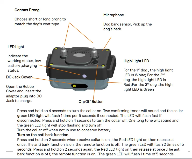 1, дальность в открытом поле до 1200 метров 2. Функция защиты от кора 3, тренируйте до 3 собак с того же передатчика 4, функция подсветки светодиодный позволяет найти питомца от 200 ~ 300 метров в ночное время 5, 10 уровней каждого статического удара 6, 10 уровней вибрации 7, «Beep» звуковая активация с отдельной кнопкой 8, две кнопки «+» и «-» позволяют установить интенсивность 9, ЖК-цифровой дисплей для 10 уровней ударов и вибрации и удостоверения личности собаки 10. Запоминает уровень ударов в передатчике для разных собак 11, легко работать с резиновой кнопкой 12, Водонепроницаемый передатчик и приемник. Собаки могут свободно плавать 13, Перезаряжаемые 3,7 V литий-ионная аккумуляторная батарея для передатчик и приемник 14, прочный ремешок из ТПУ с воротником 15, светодиодный индикатор низкой мощности, красный светильник будет мигать при низком уровне заряда батареи 16, полностью функциональная система для обучения собак 17, около 8 секунд безопасная защита от статического удара 18, поставляется с гарантией8. Все расходы на обратную доставку оплачивает покупатель