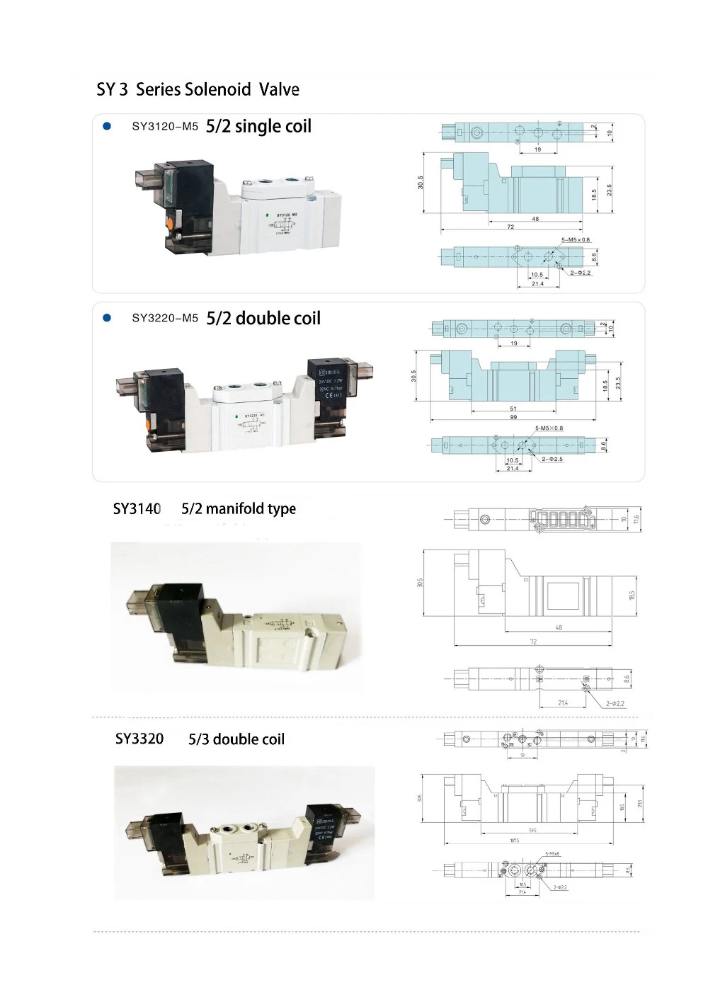 В SY3000 и SY5000 имеют один и тот же ширину клапана, так же, как их предки, но поток было увеличено до 80%, что позволяет уменьшить размер клапана. Встроенный фильтр в пилотном клапане предотвращает проблемы, вызванные посторонними веществами. Благодаря использованию H - NBR уплотнительного материала для основного клапана и уплотнения, озоновое сопротивление было улучшено. Боковые, верхние и нижние порты/Трубопроводные направления доступны для гибкой установки. SY доступен в портированных или базовых стилях, и может использоваться индивидуально или коллекторно.