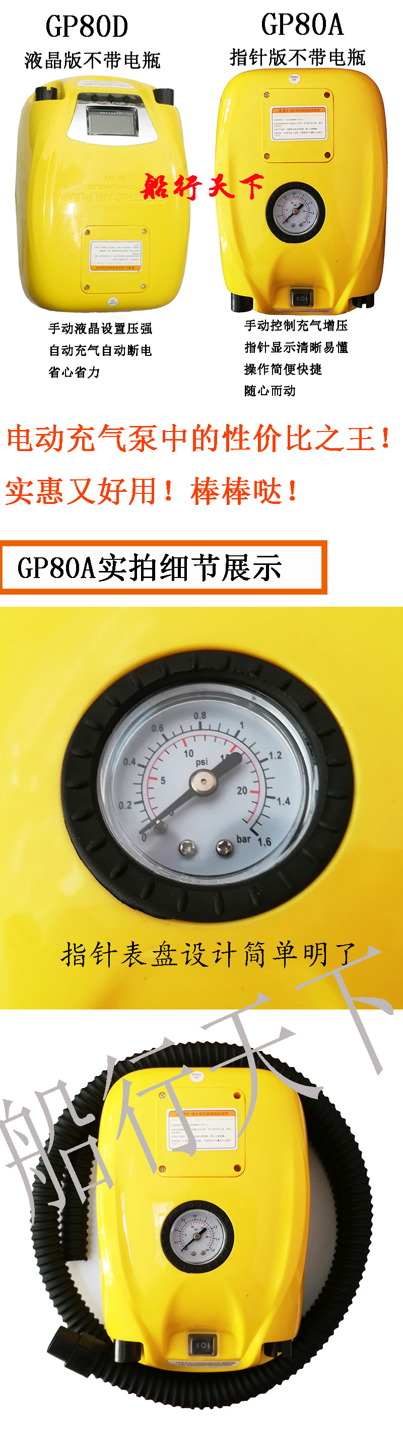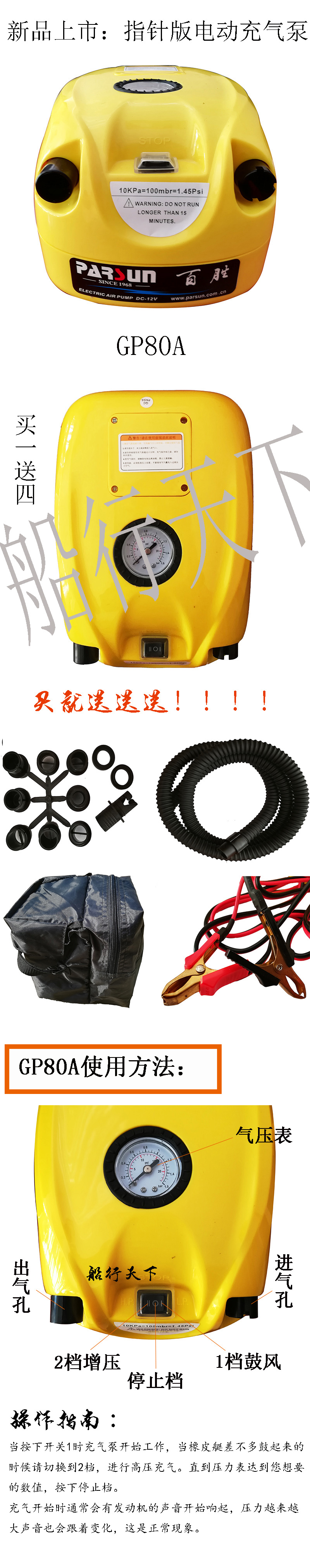 Воздушный насос GP-80: Большой объем (барбин) + высокое давление (поршень), два этапа; Автоматическая остановка, когда выбрано давление; Надувание и сдувание, водонепроницаемая кнопка управления; Шнур питания 9 футов и трубка 6 футов; Оснащена сумкой через плечо; Простота в использовании-просто подключите аккумулятор 12 В для зарядки; Прочный и долговечный дизайн; Включает в себя 8 адаптеров для надувания шин, спортивного и другого оборудования для кемпинга.
