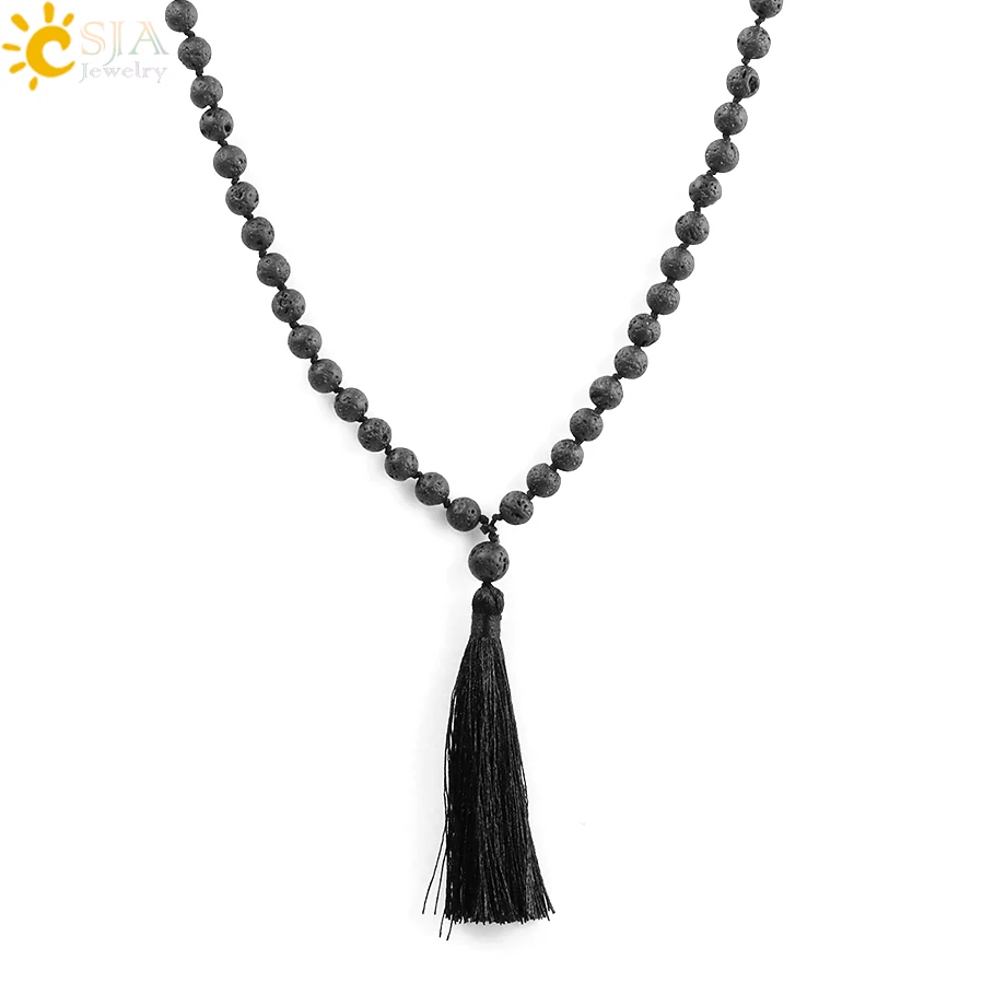 CSJA натуральный черный 108 Mala Lava бусы Макси богемные ожерелья шелковая кисточка оригинальный камень бисером цепь мужские рейки ювелирные изделия F073