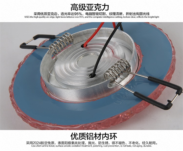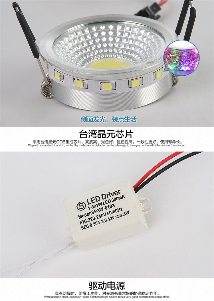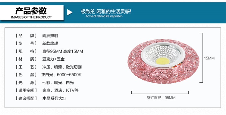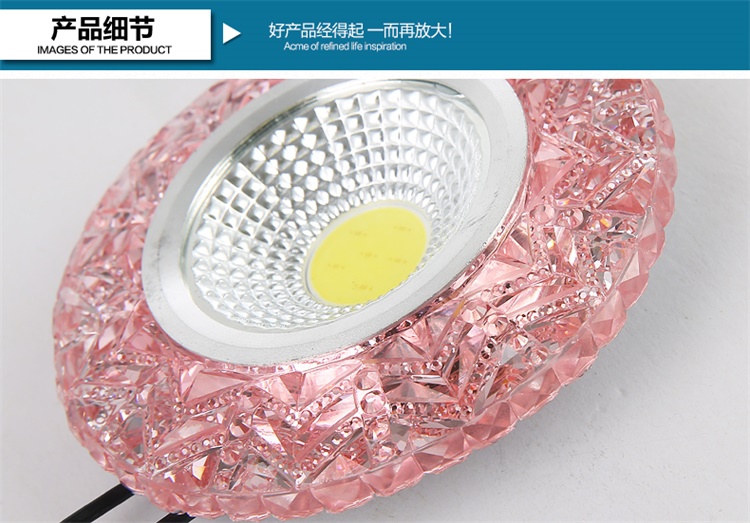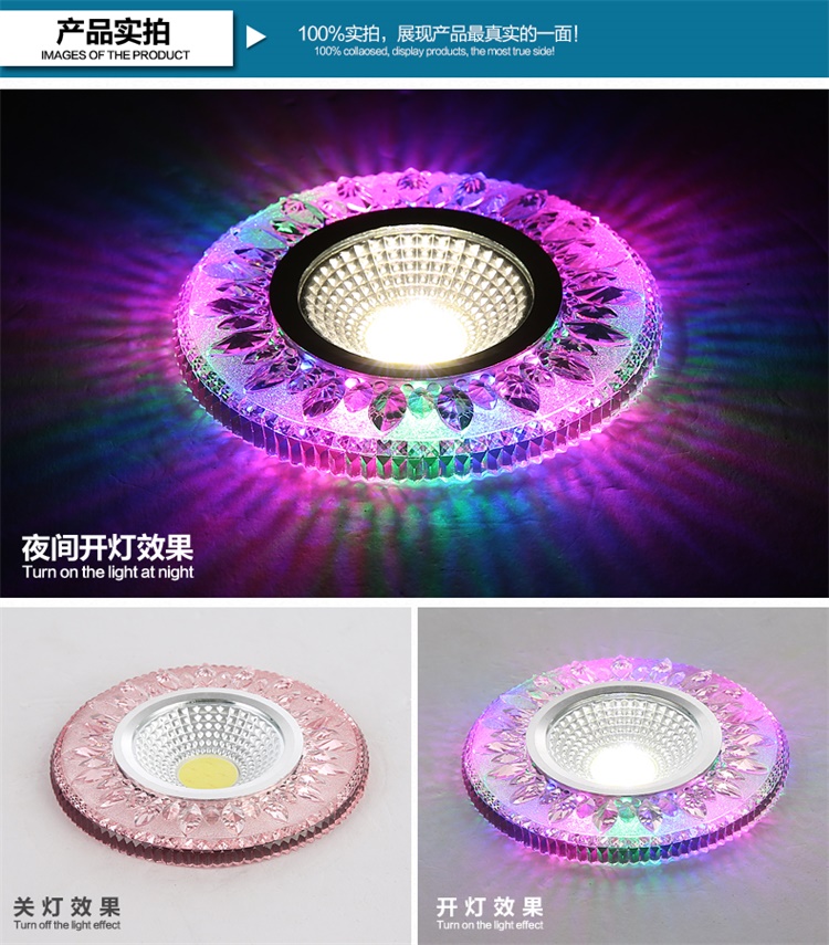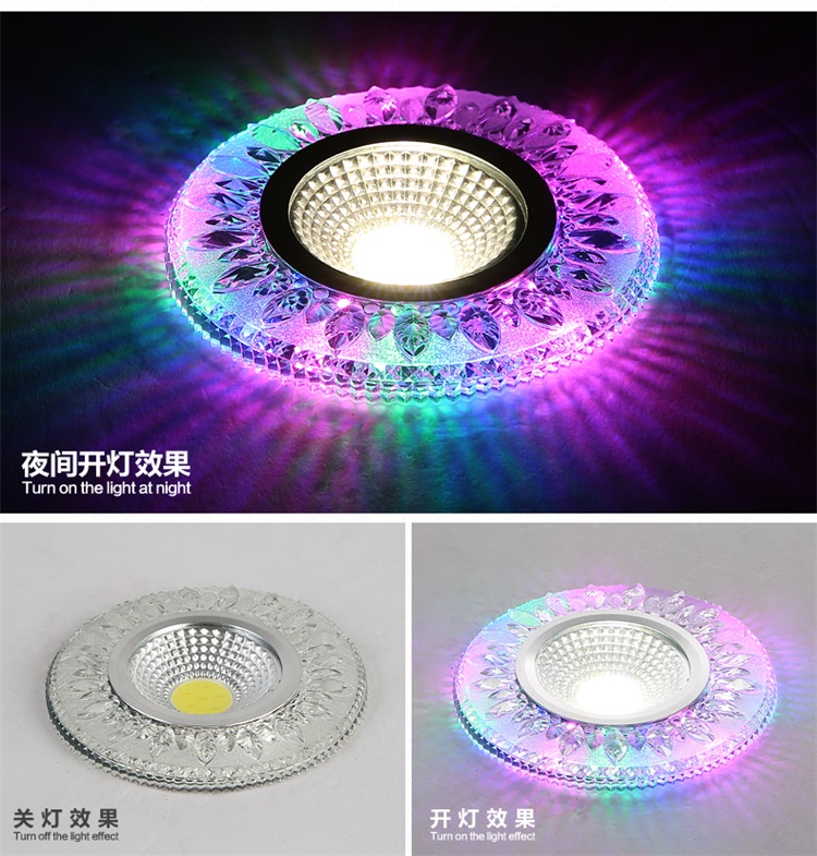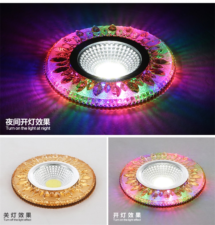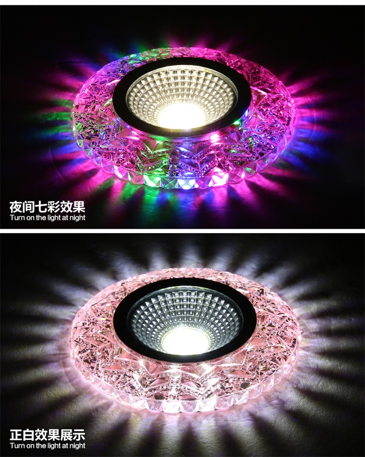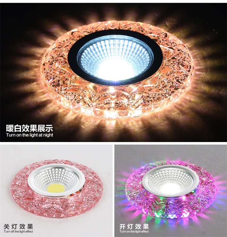 Современные 4 Вт COB светодиодные светильники, светодиодные потолочные светильники с кристаллами, 3 Вт + 1 Вт, внутреннее светодиодное украшение, двухцветное боковое освещение для дома Технические характеристики Источник освещения: 3 Вт основной источник света + 1 Вт вспомогательный источник света Коэффициент мощности: 80% Количество светодиодов 3 шт. Материал: алюминий + кристалл Входное напряжение: AC85-265V Потребляемая мощность: 4 Вт Ток переменного тока 290ма Угол луча: 120 Размер изделия: 90*15 мм Светящийся 270 лм Индекс цветопередачи: Ra80 Размер отверстия: 75 мм Рабочая температура: от-20 до 50 Длительный срок службы: 50 000 часов Водонепроницаемость: IP44 Сертификаты: ROHS и CE Круглая форма