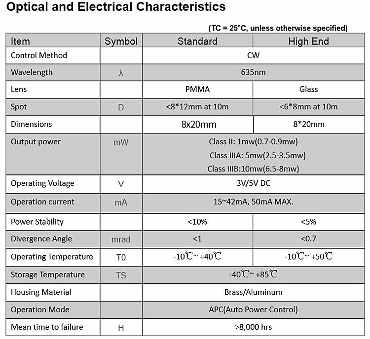 Схема вождения лазерных модулей может быть APC (автоматическое управление питанием) или ACC (автоматическое управление током).
