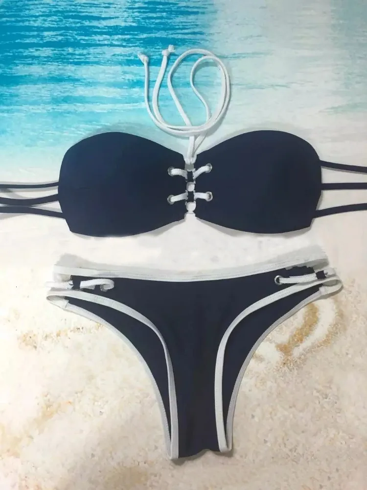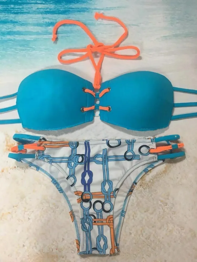 Женский комплект бикини из 2 предметов, Мягкий купальник с принтом, синий купальник с лямкой на шее, пляжная одежда на косточках, купальный костюм, сексуальный купальник с низкой талией, бикини XL