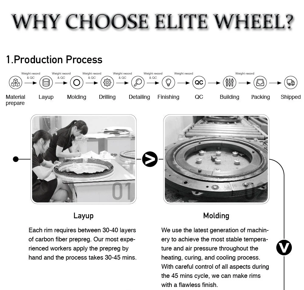 Каждое производственное звено ELITEWHEELS имеет контроль качества, чтобы строго контролировать и записывать производственный процесс, содержание смолы в препреге, вес обода, температуру окружающей среды, метод ткачества, количество материалов, угол сверления, натяжение спицы, влажность подшипника, жесткость колес, Давление в шинах и все детали находятся в центре нашей заботы, просто чтобы доставить самый идеальный продукт клиенту.