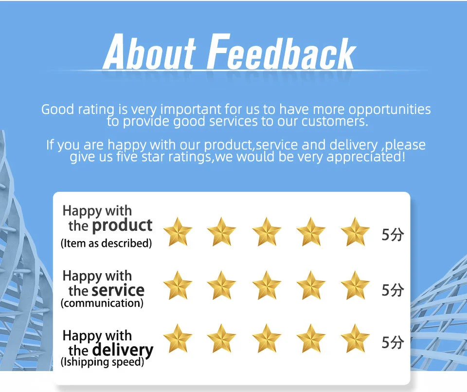 Если вы удовлетворены нашей продукцией, пожалуйста, дайте мне хорошие отзывы и дайте мне 5 звезд, спасибо. Если вы не удовлетворены нашей продукцией, пожалуйста, свяжитесь с нами и скажите, в чем проблема, мы поможем вам решить эту проблему.