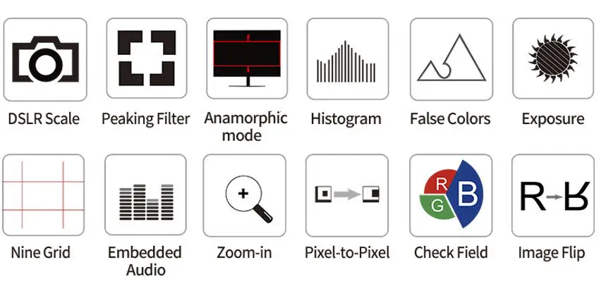 FEELWORLD T7 интегрированная гистограмма, встроенное аудио, помощь в фокусировке, ложный цвет, экспозиция, поле проверки, девять ячеек и увеличение профессиональных функций, помогает пользователям точно подвергать воздействию и фокусироваться при съемке, создание и воспроизведение фильмов/видео.