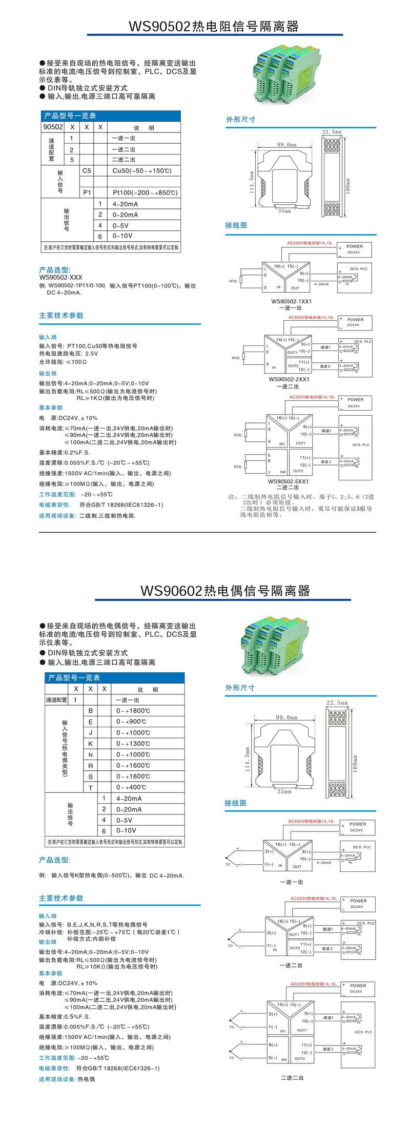WS90502 thermoelectric resistance full isolation signal conditioner, support PT100, Cu50 and other sensor signals direct input, including linear cold end temperature compensation, three port isolation, with on-line fault self diagnosis function, 35mm standard guide rail installation, can be used for a large number of dense control cabinet.
