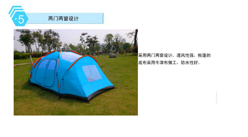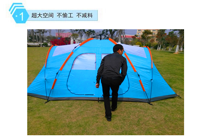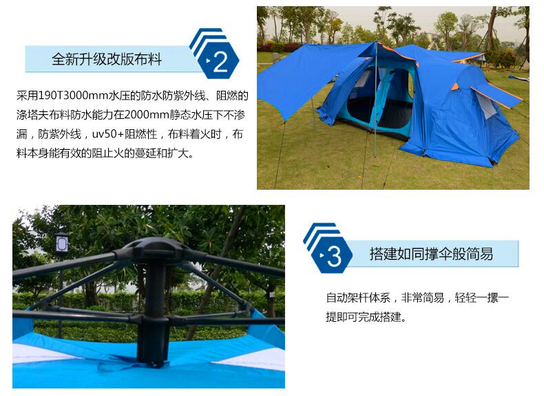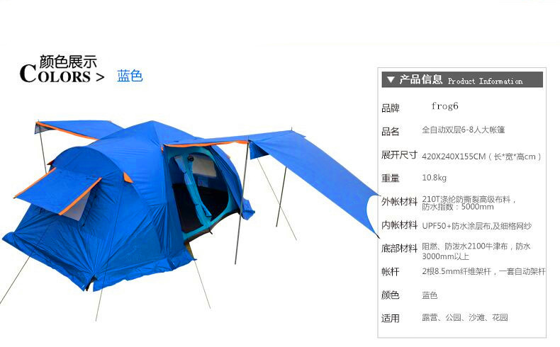 Размеры: 410*240*155 см Вес: около 10,8 кг. Flysheet: 210T полиэстер тафты Водонепроницаемый ПУ покрытие УФ устойчив к давлению воды более 3000 мм, весь шов Flysheet расположен на термогерметичной водонепроницаемой ленте PU для предотвращения проникновения дождевой воды из швов. Внутренняя палатка: 190T полиэстер Тафта ПУ водонепроницаемая ткань с покрытием, и легкая тонкая сетка: + B3 высокая плотность анти-москитная сетка давления 2500 мм. Базовая ткань: 210D Оксфорд водонепроницаемый 3000 мм более пригодный для носки, F/R. Полюс: 1 комплект Автоматическая рамка бар + 2 8,9 мм БТП + 1 комплект 16 мм стальные опоры (по умолчанию в одном комплекте, в том случае, если нужно 2 комплекта, просьа связаться с нами, чтобы проверить, цена) Аксессуары: ветровая веревка, чтобы D с хорошим полным. Внешний подряд: 210T PU водонепроницаемая сумка для переноски. (100*20*20 см)Примечание: Азиатские клиенты могут попросить у продавца скидку.