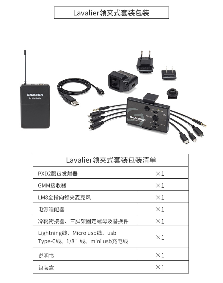 Go Mic Mobile® Lavalier Беспроводная системаВ дополнение к Go Mic Mobile® (GMM) приемник, уникальный настроенный микрофон Mobile® Lavalier беспроводной системы ОсобенностиСамсонPXD2 Beltpack передатчик и LM8 всенаправленный правосторонний микрофон для до 100' от сжатой цифровой беспроводной операции.