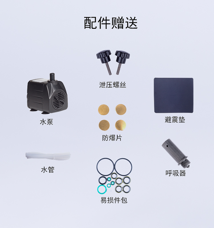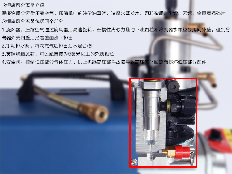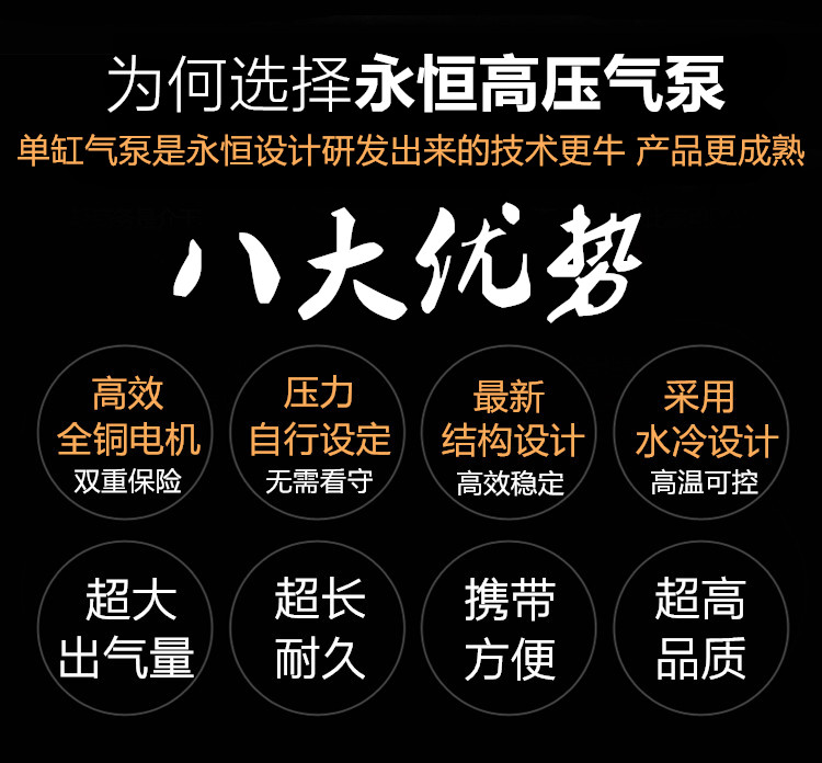 Непосредственно решить проблему износа поршневых колец Обычные поршневые кольца имеют срок службы всего 10 часов. Высокая температура подвержена выгоранию и износу, и поршневое кольцо необходимо часто заменять. Новый дизайн поршня высокого давления имеет безуходный срок службы более чем в 10 раз больше, чем у обычного поршневого кольца. Фиксированный поршневых колец Фиксированные чашки с высокой эффективностью закрытия воздуха Углеродное волокно + ПТФЭ + медный порошковый материал Высокая термостойкость, более износостойкость, стабильная и долговечная Параметры машины Модель: версия Seiko (1 литровый флакон) Мощность: 1800w Рабочее давление: 0-40MPA Взрывобезопасное давление: 28-30 мпа Функция: встроенный + внешний фильтр для разделения масла и воды, защита от перегрузки двигателя, безопасная Взрывозащищенная функция, может заряжаться маленькая бутылка объемом 1 л Непрерывное рабочее время: 20 минут Метод охлаждения: водяное охлаждение + воздушное охлаждение Метод сжатия: вторичное сжатие Цилиндр высокого давления: точная трубка зеркала Вес: 17,5 КГ Объем: 34*18*34 см