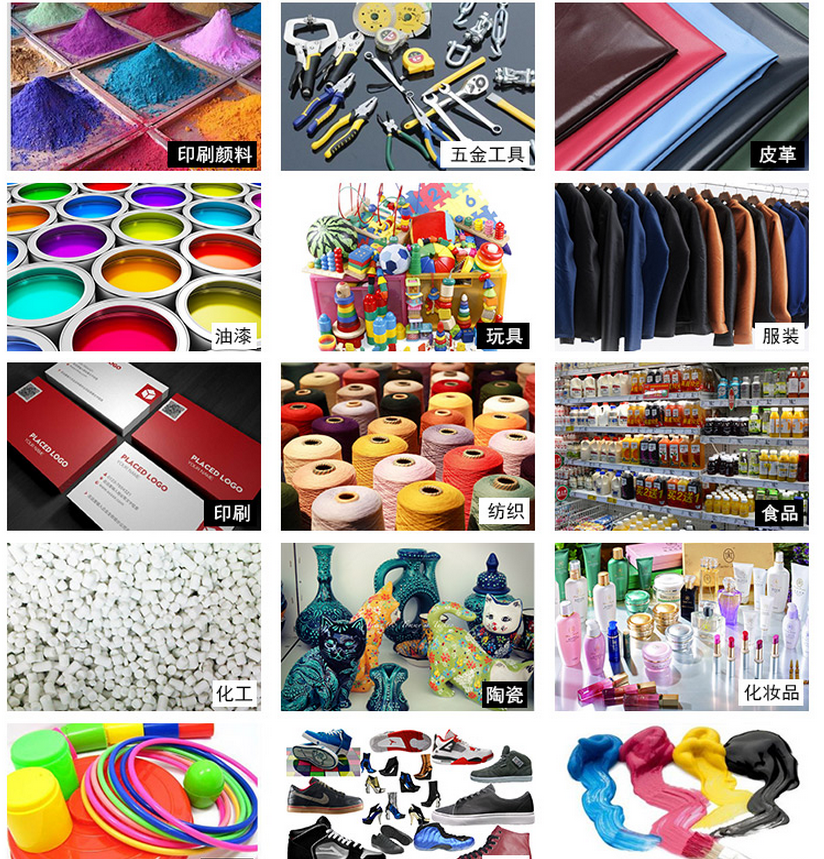Применение: текстиль, автомобили, керамика, косметика, окрашивание, еда, обувь, чернила, ткани, упаковка и печать.
