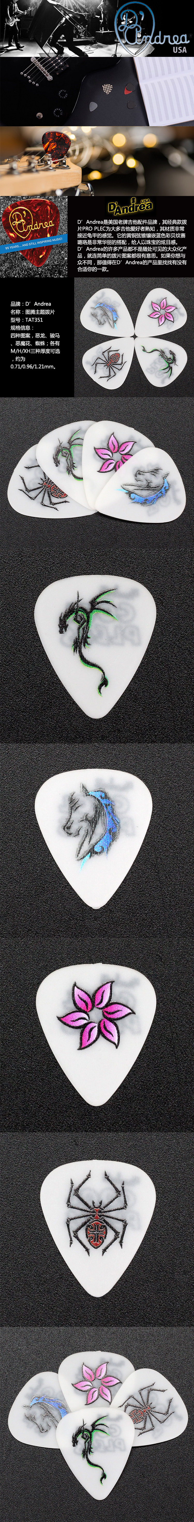 D'Andrea США татуировки выбирает изготавливаются из самого жесткого материал дельрин и украшена Выберите татуировки изображения. Пики татуировок являются частью более широкой крутой линии гитарных пиков. Они имеют ассортимент забавных тем и украшены разнообразными материалами, подходящими для любого игрового стиля. Гордо Сделано в США!