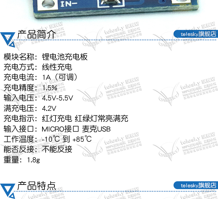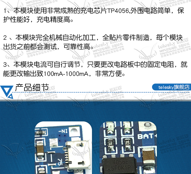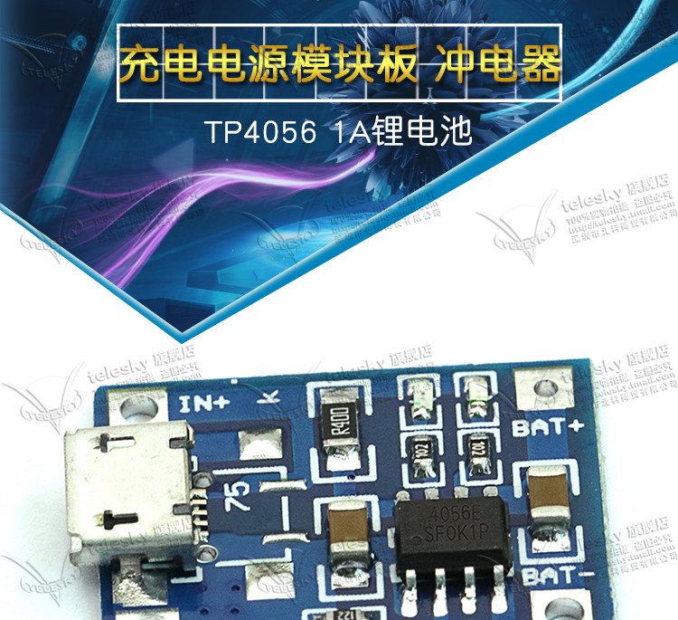 Название модуля: плата для зарядки литиевой батареиМетод зарядки: линейная зарядкаТок зарядки: 1 А (регулируетсяТочность зарядки: 15%Входное напряжение: 4.5V55VНапряжение полной зарядки: 4,2 ВИндикация зарядки: красный свет зарядка светофора всегда яркий полный зарядВходной разъем: MCRO разъем mic USBРабочая температура: от-10 °C до + 85 °CМожет быть обратное соединение: не может быть обратнымВес: 18 г Особенности 1, этот модуль использует очень зрелый чип зарядки TP4056, периферийная цепь проста, защищаетХорошая защита и высокая точность зарядки.2, модуль полностью механической автоматической обработки, производство полностью патч частей, каждый модульОн будет протестирован перед отправкой и имеет высокую надежность.3. Ток этого модуля может быть отрегулирован самостоятельно. Просто измените фиксированное сопротивление в печатной плате.Очень удобно менять выход на 100mA-1000mA.