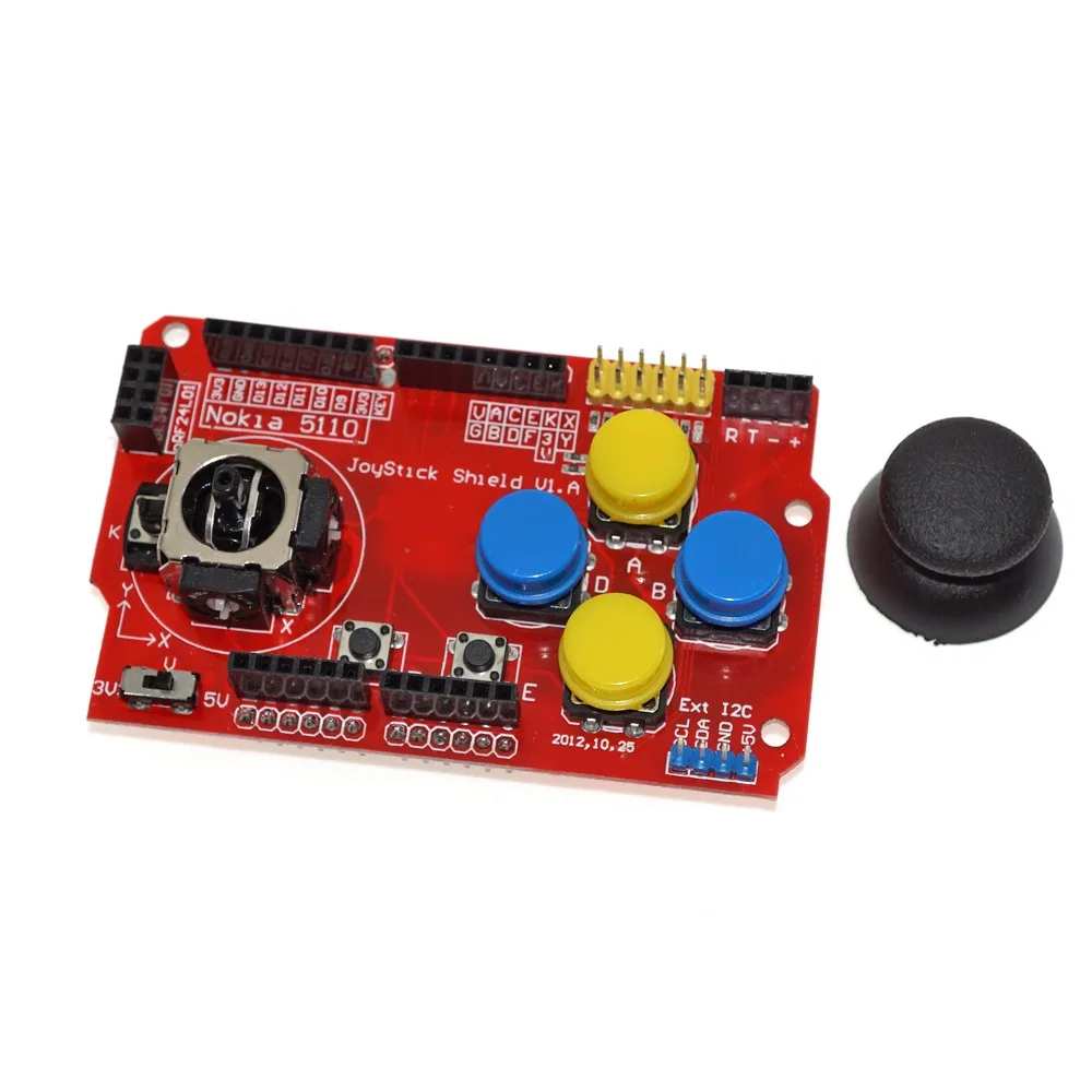 Щит джойстика подключается непосредственно к пластине UNO, Leonardo или MEGA type и позволяет быстро и без осложнений иметь контрольную пластину. Джойстик является аналоговым и непосредственно подключен к аналоговым входам Arduino, кроме того, вы можете нажать, чтобы добавить другую функцию. Плата также имеет 4 кнопки с рамкой, подключенной к цифровым контактам. Поставляется в собранном виде с помощью штифтов, кнопки и джойстика, нет необходимости припаять, поэтому вам просто нужно подключить его и вы готовы.