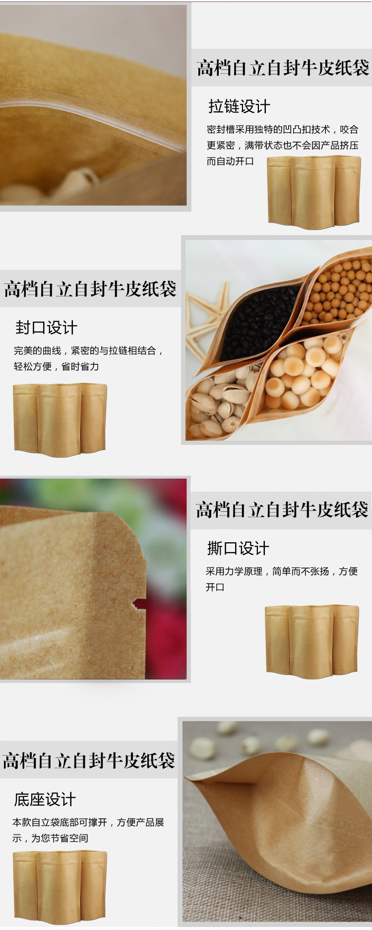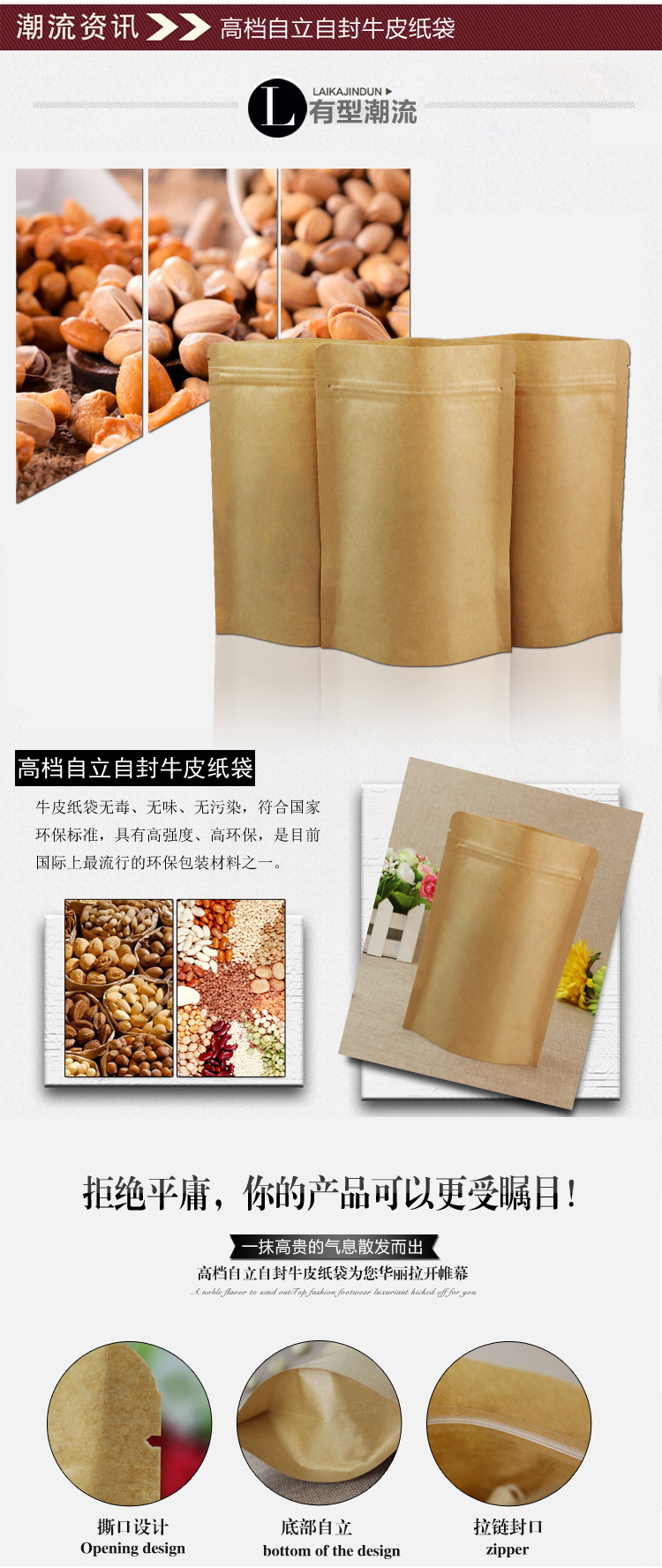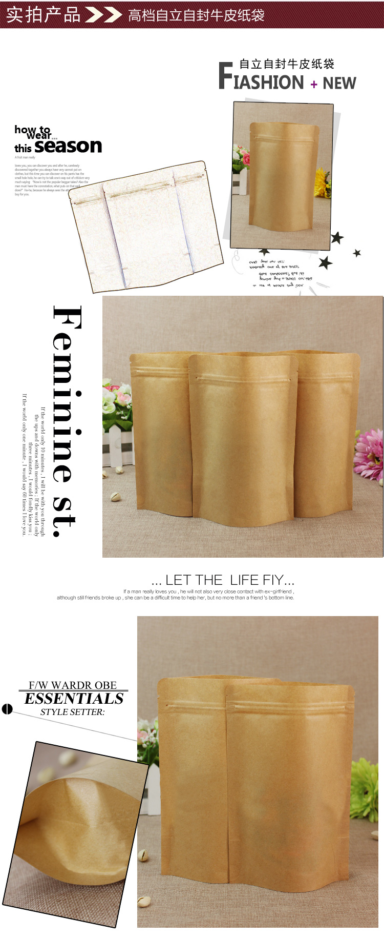 Material: Kraft paper Suit for: Cookies, Candy, Dried fruit, snack food, grain, tea, Coffee,medicine Application: Kitchen, baking shop, party, wedding Feature: Stand-up, zipper closure Size: 9x14, 11x18, 13x18, 13x21, 15x21, 15x24, 17x24, 18x30, 20x25, 20x30, 23x33cm Pictures Application of the food kraft paper bag with frosted window: