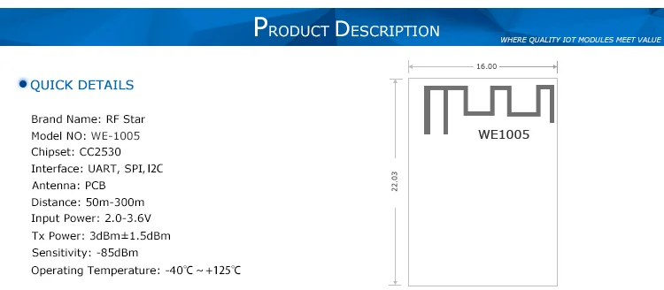 ZigBee RF модуль WE1005 основан на чипе CC2530 от TI. Модуль может широко использоваться в локальной сети с низкой мощностью. Конденсатор и индуктор используют высокоточные, высокочастотные серии Q muRATA. С бортовым силовым фильтром И оптимизированная RF схема соответствия, модуль имеет лучшую стабильность и расстояние передачи. В Кроме того, модуль может добавить защитный чехол, чтобы повысить способность анти-помех, поэтому Может использоваться в промышленных целях.Модуль прошел сертификацию FCCLМодуль Особенности