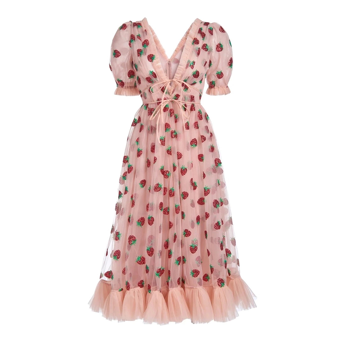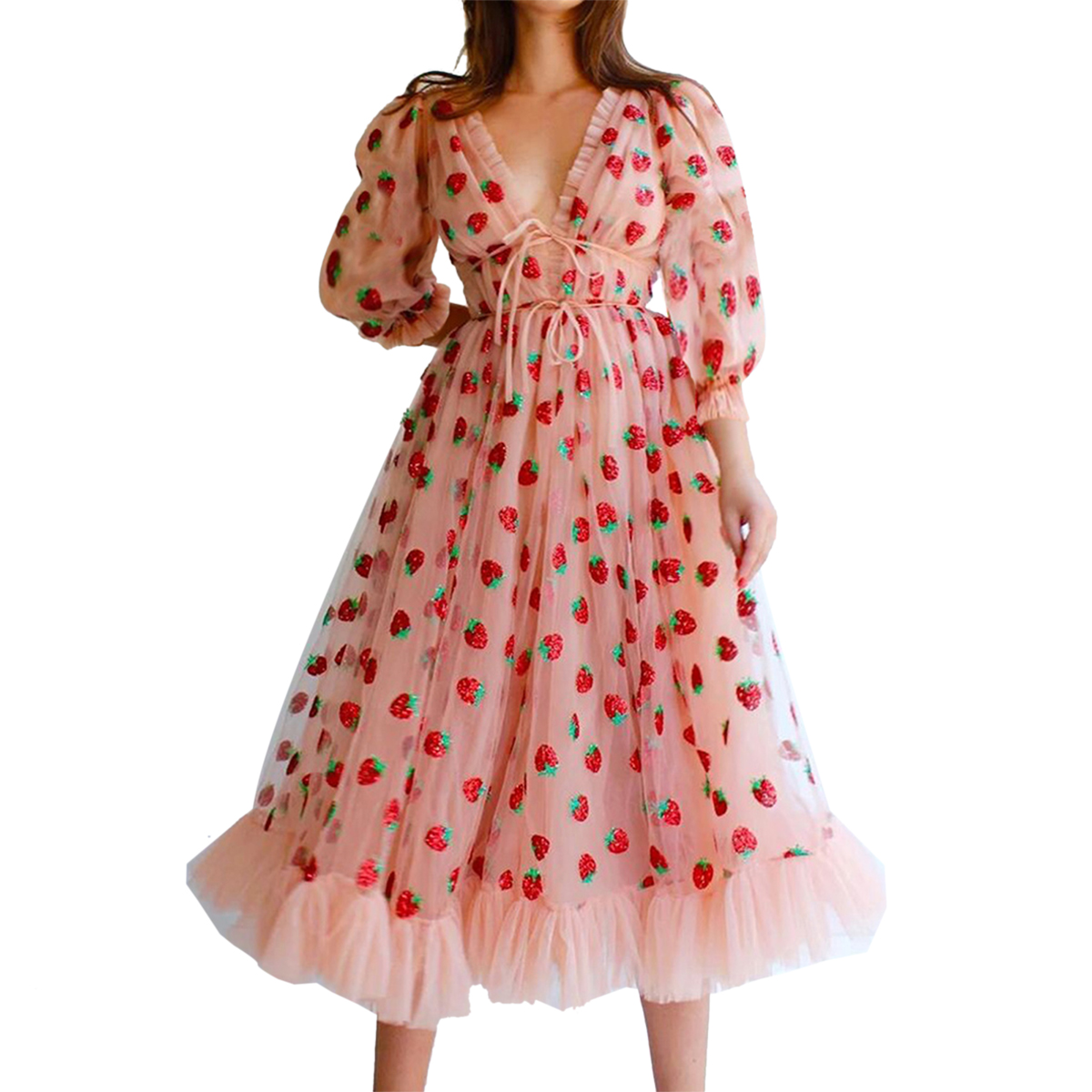 Женское платье с коротким/длинным рукавом, платье с v-образным вырезом и эластичной резинкой на талии с вышитой клубникой