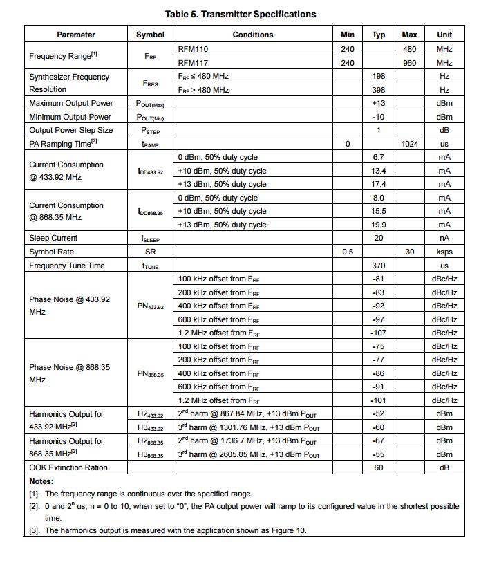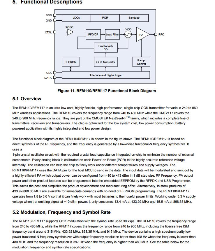 ● Встроенный EEPROM Простой развития с rfpdk Все параметры программируемый • Диапазон частот: 240-480 МГц (RFM110) 240-960 МГц (RFM117) ●Ook режим модуляции • Скорость передачи данных: 0,5-30 кбит/с ● 1 провод интерфейс ● Мощность передачи: -10-+ 13 дБм ● Диапазон рабочего напряжения: 1,8-3,6 V • Рабочий ток: 12,4 мА @ + 10 дБм ● Ток сна: < 20 на ●Fcc/ETSI стандарт ●Rohs стандарт ● Размер модуля: 17,8*12,8*5,0 мм Основное применение: ● Недорогое применение бытовой электроники ●Home и систем автоматизации для зданий ●Fan дистанционный пульт ●Replace инфракрасный излучатель ●Industrial мониторинга ●Remote светильник управления ● Беспроводная сигнализация и система безопасности ●Remote дверной замок
