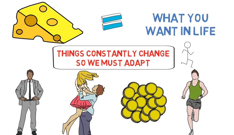 В истории персонажи сталкиваются с неожиданными переменами в поисках сыра. Один из них в итоге успешно справляется с переменами и записывает то, что он узнал на стенах лабиринта, чтобы вы могли открыть для себя. Вы научитесь предвидеть, адаптироваться к изменениям и наслаждаться ими и быть готовыми быстро меняться, когда вам нужно.