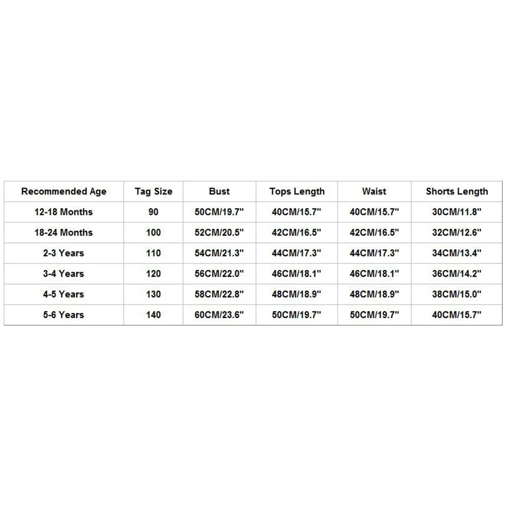 Recommended AgeTag SizeBustTops LengthWaistShorts Length12-18 Months9050CM/19.7"40CM/15.7"40CM/15.7"30CM/11.8"18-24 Months10052CM/20.5"42CM/16.5"42CM/16.5"32CM/12.6"2-3 Years11054CM/21.3"44CM/17.3"44CM/17.3"34CM/13.4"3-4 Years12056CM/22.0"46CM/18.1"46CM/18.1"36CM/14.2"4-5 Years13058CM/22.8"48CM/18.9"48CM/18.9"38CM/15.0"5-6 Years14060CM/23.6"50CM/19.7"50CM/19.7"40CM/15.7"