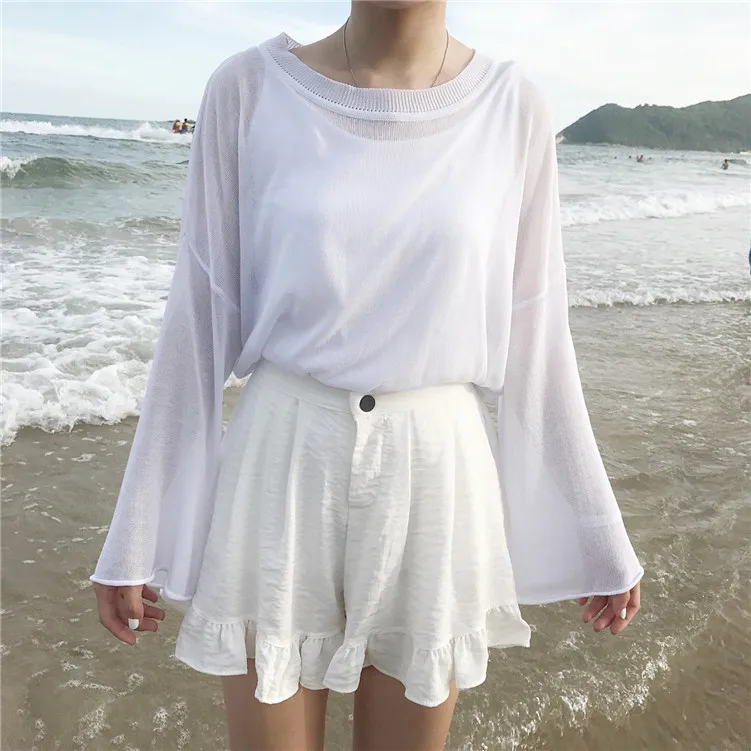 Korean Women Knitted Tees Top Summer Sexy Mesh Tops Beach Style See-through O-neck Long Sleeve Loose Long Tshirt