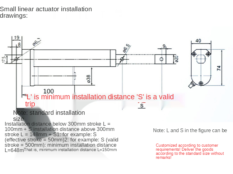 2. Размер установки: (1): после того, как толкатель полностью втянут, расстояние в центре между передними и задними монтажными отверстиями, то есть минимальное расстояние установки толкателя (то есть длина самого толкателя). Ниже 300 мм ход L (Размер установки) = 100 мм + S (ход), 300 мм и 300 мм ход или более L (Размер установки) = 148 мм + S (ход). (2): толкатель полностью расширен до центрального расстояния между передними и задними монтажными отверстиями (ход ниже 300 мм) = 100 мм + с (ход) + S (ход), (выше 300 мм и 300 мм ход) = 148 мм + S (ход).