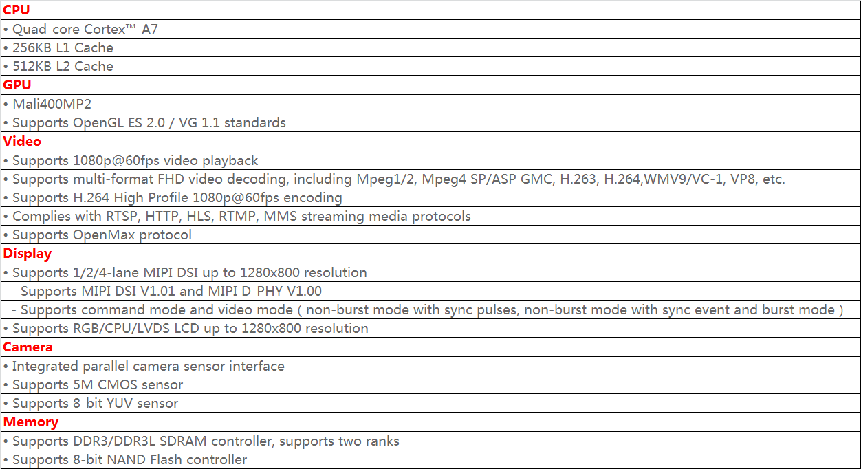 Встроенная графическая карта главного чипа управления Mali400MP2, которая поддерживает H.264 1080 P кодирование видео (60 кадров в секунду) и 1080 P декодирование видео.