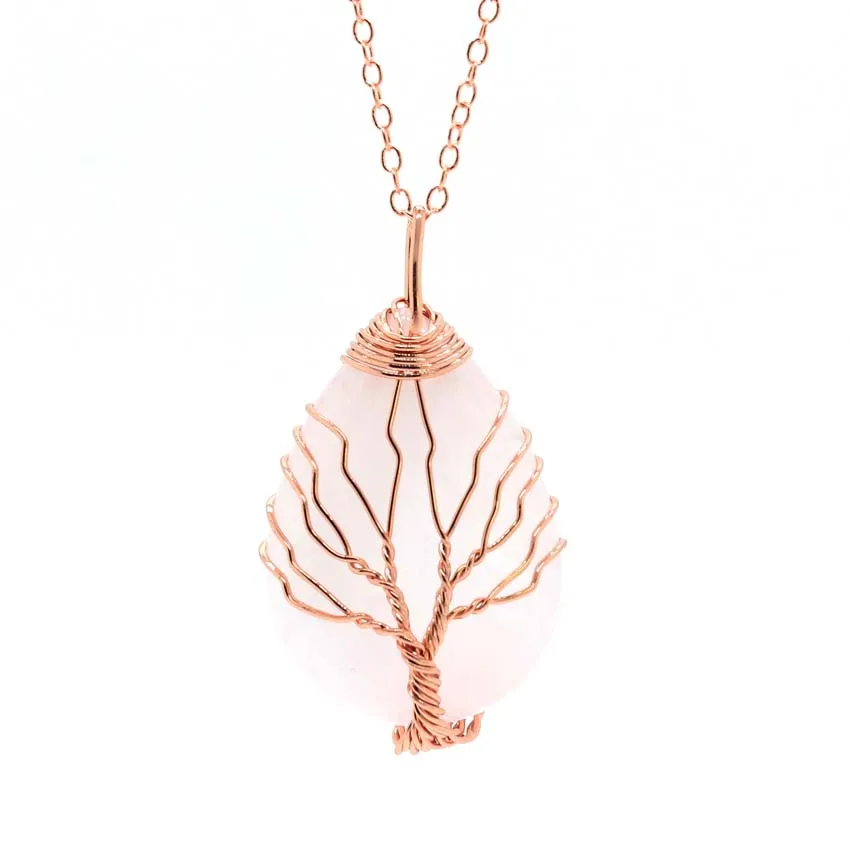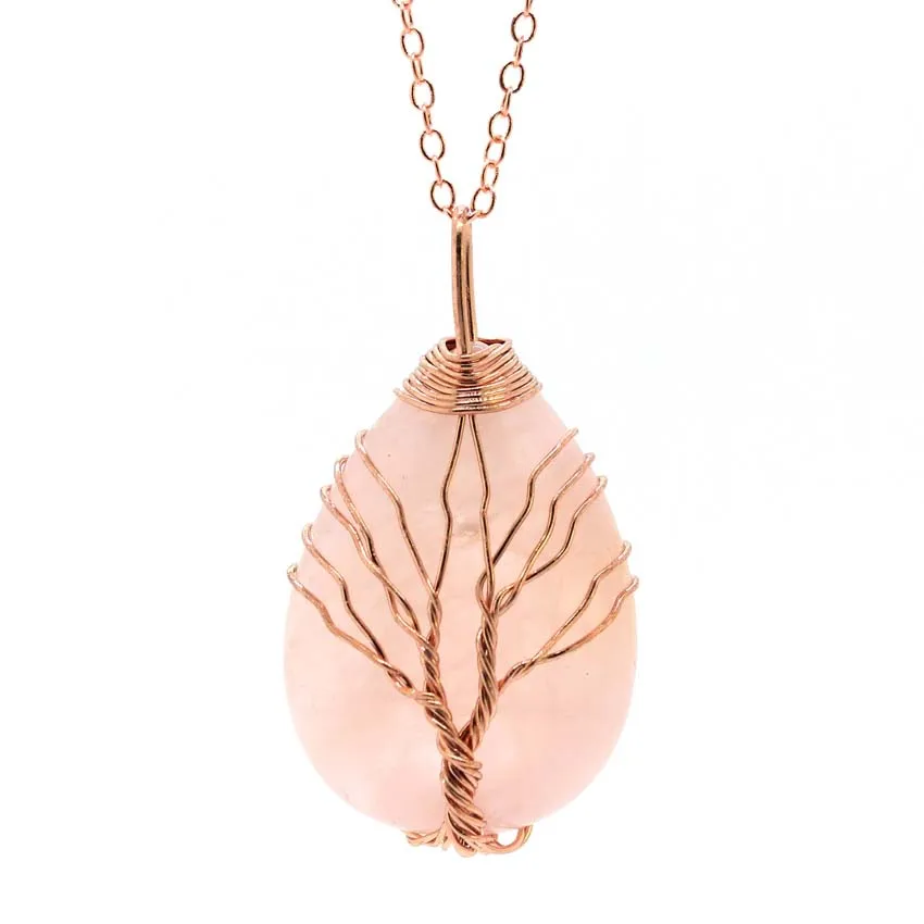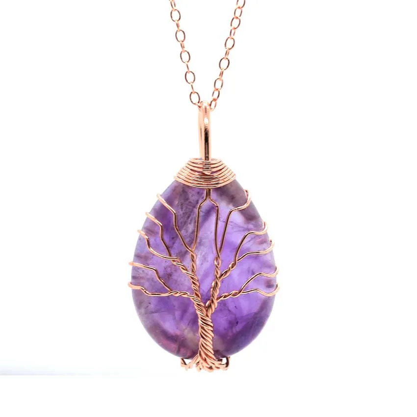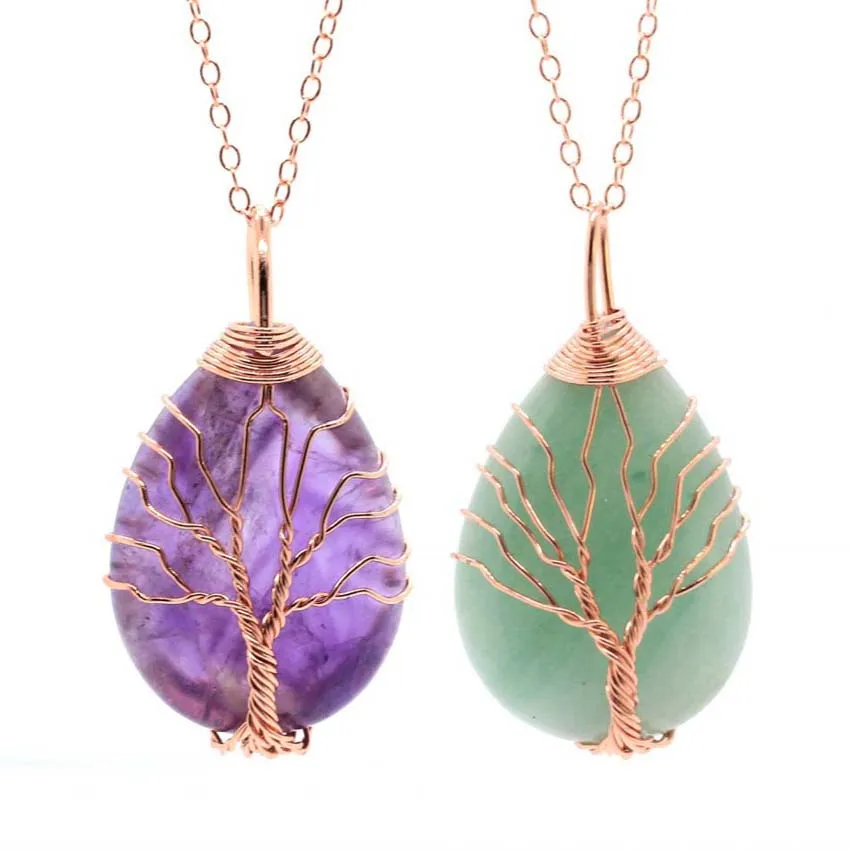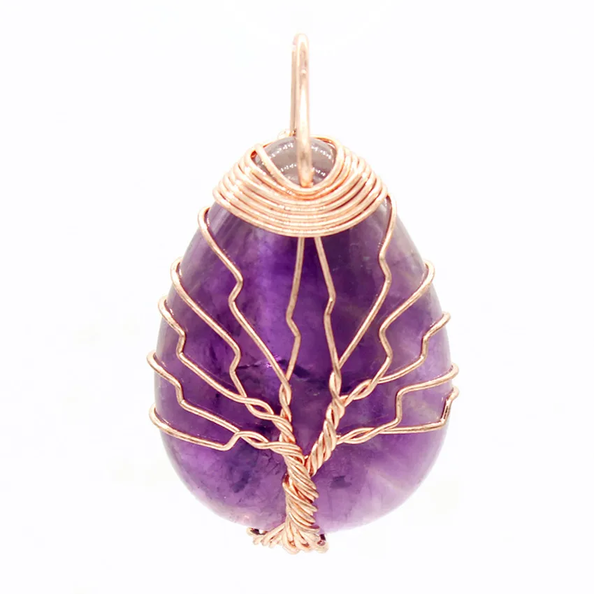 KFT натуральный лечебный Кристал, кварц камень «Reiki» кулон ручной работы обернутое Дерево жизни капля Аметист цепь ожерелье