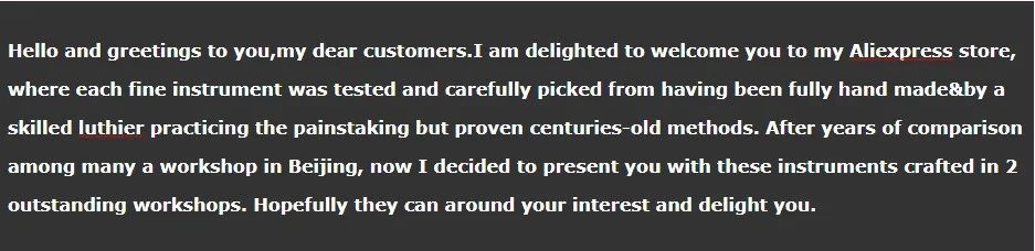 Она(Скрипка 4/4) Был выбран из Пекин Мастерская скрипки Ван чжиго, Который имеет историю 25 Лет иВладеет нашим Luther, Master Wang. Настоящий артистский стиль,Он путешествовал Италия Для дальнейшего изучения скрипки и возврата через 3 года.ОнНе производит много инструментов В течение года, хотя Каждый предмет онОтделка абсолютно классическая. Как лучшее качество, Мастер Ван всегда Принимает такие Факторы как индивидуальный характер И резонансаКаждого из различных пород древесины, корректировкаВ ходе строительства Убедитесь, что звук красивый, а не просто соответствует стандарту длины, АРКА, ширина и что нет.Эта скрипка была тщательно сделана вручную после скрипки Stradivari 1716 Messiah; он выбрал лучший тон боснийского кленового дерева для спины, лучшая тональная австрийская ель для фронта, она проецирует надежный, глубокий, красиво богатый, полный, зрелый, хорошо сбалансированный, очень чистый и чистый, сладкий проекции, а также на высокой регистрации.