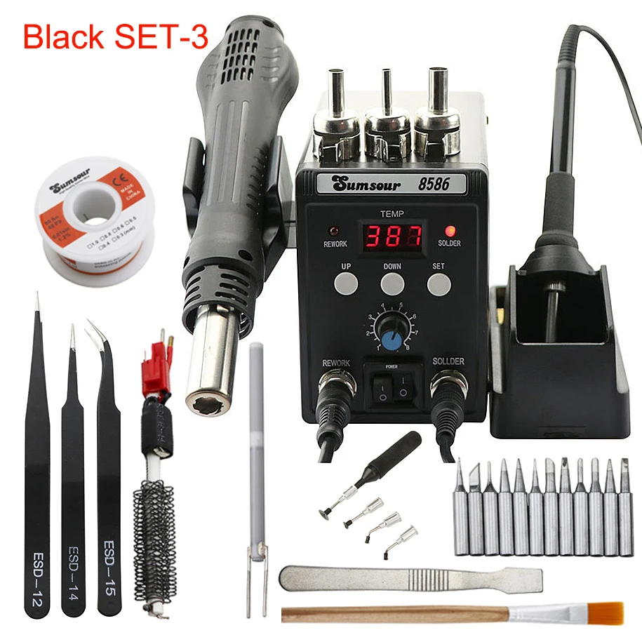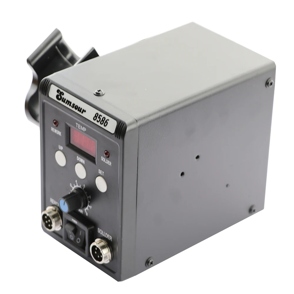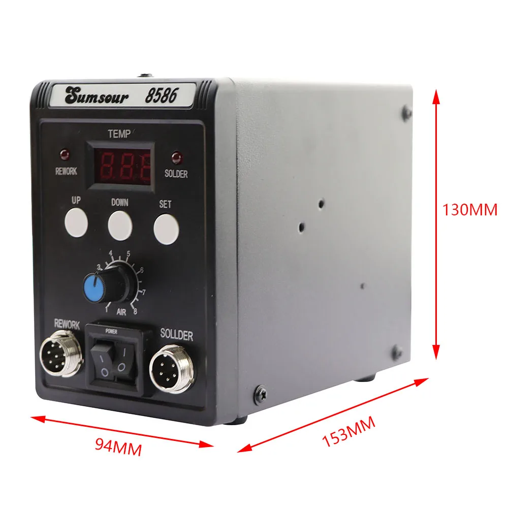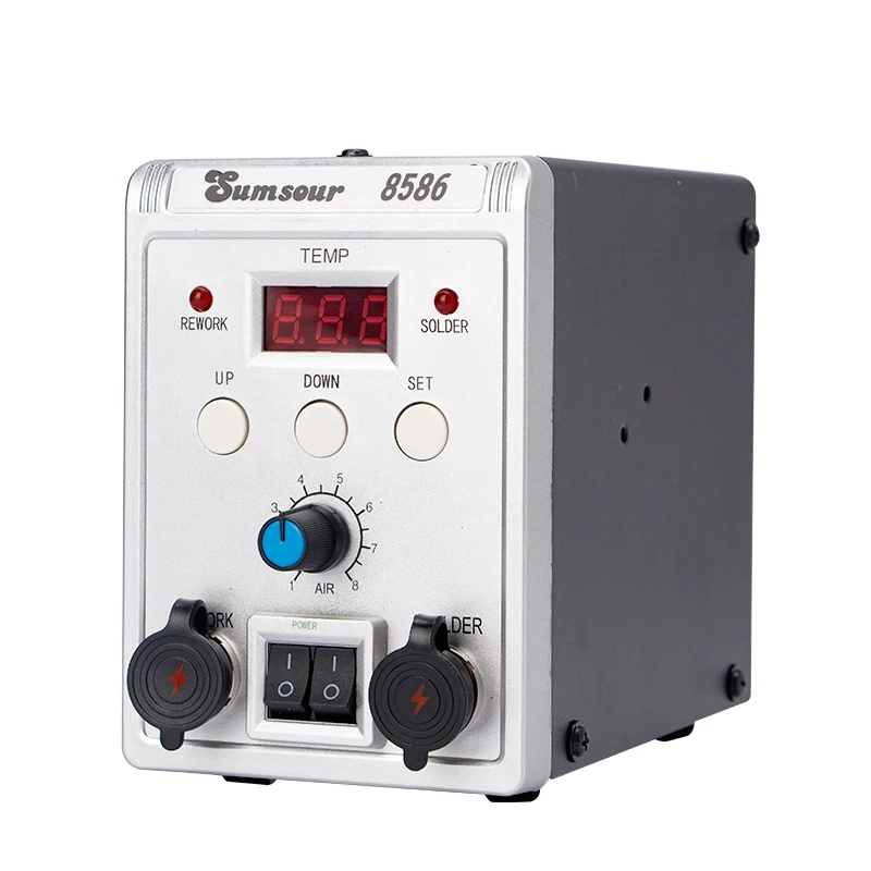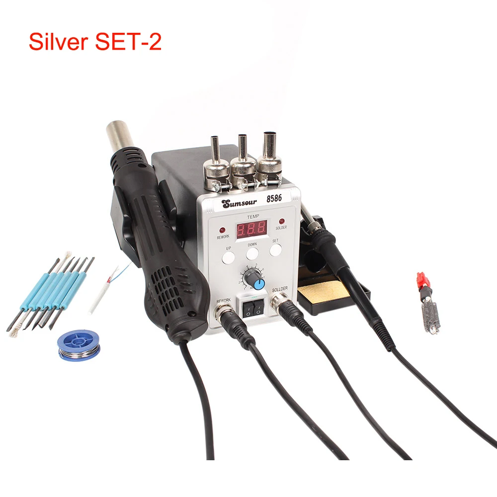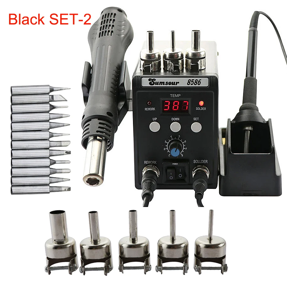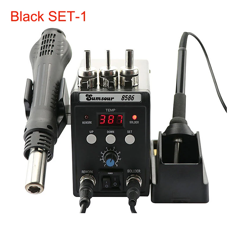 Это совершенно новая паяльная станция SMD 2 в 1 8586. Металлический корпус из сплава с высококачественным силиконовым корпусом отличается элегантным внешним видом и энергосбережением. Вы можете использовать Термофен и паяльник отдельно, без помех друг другу.