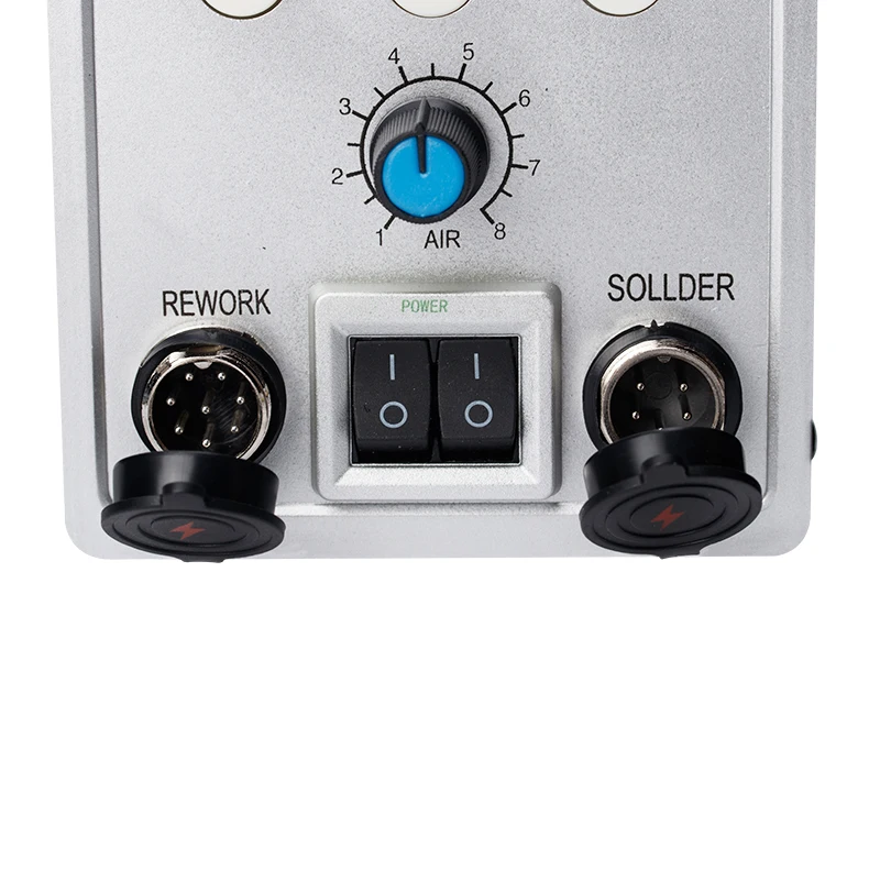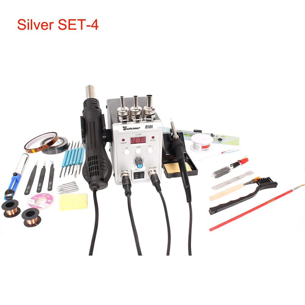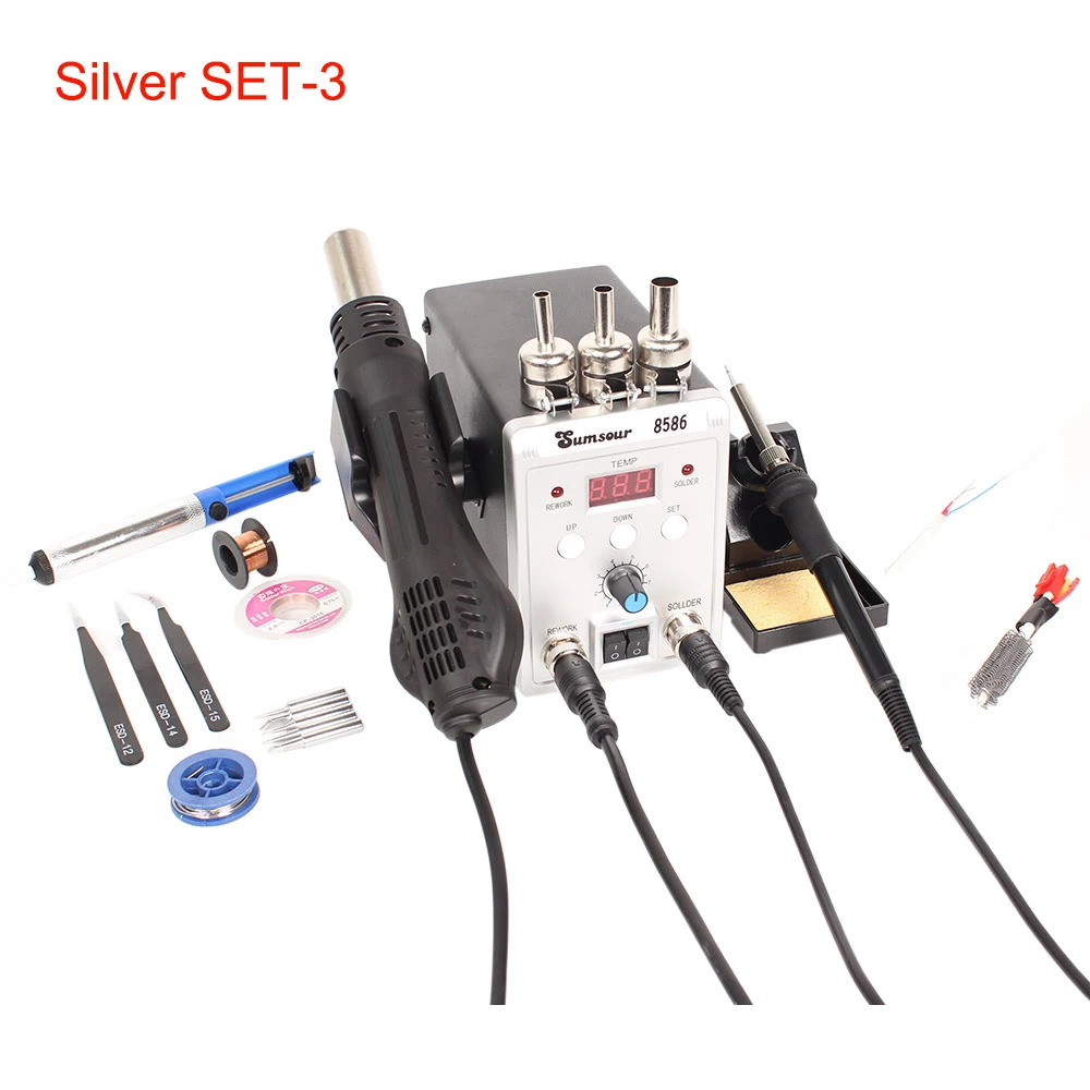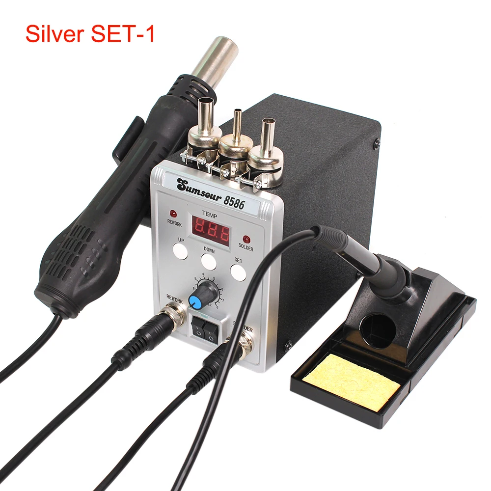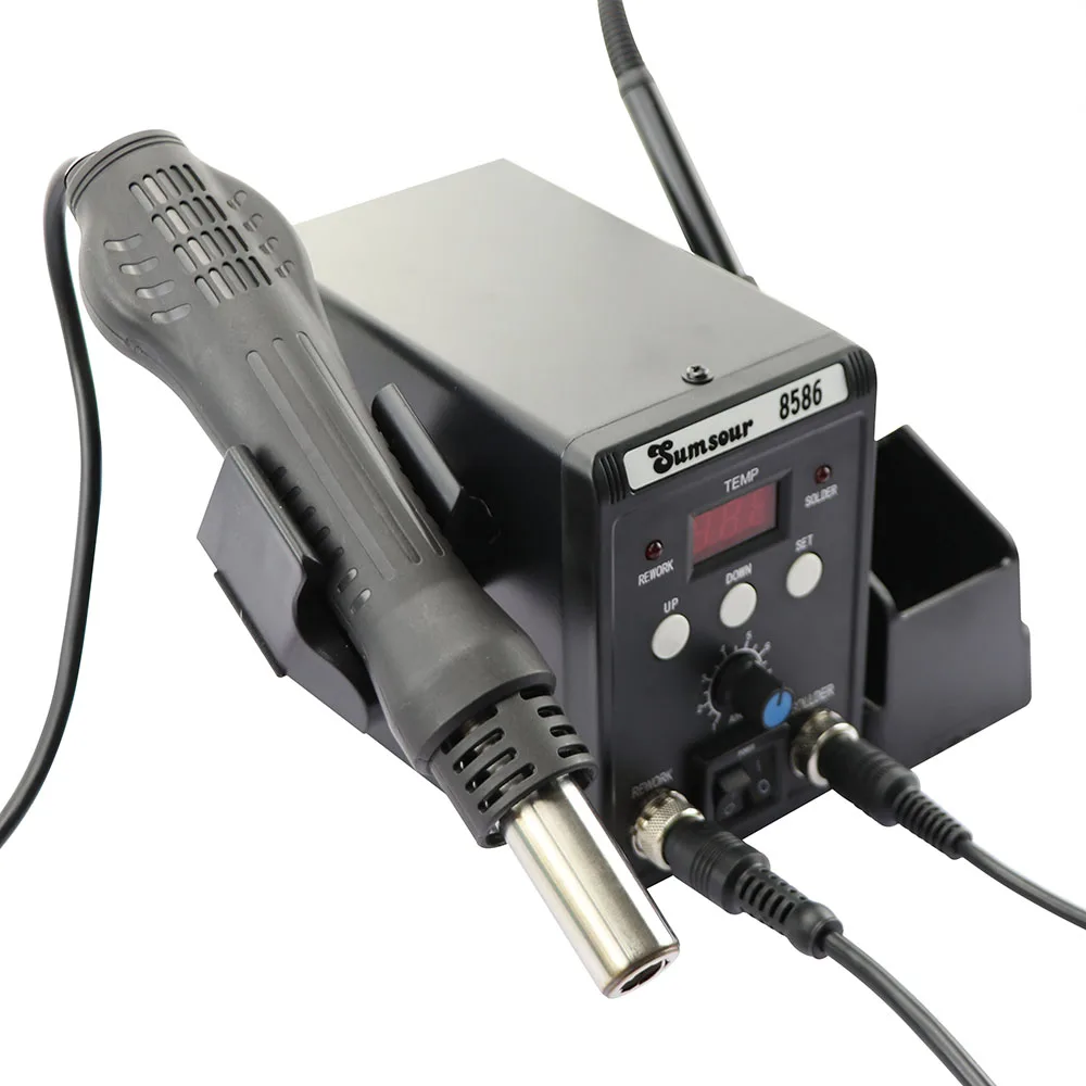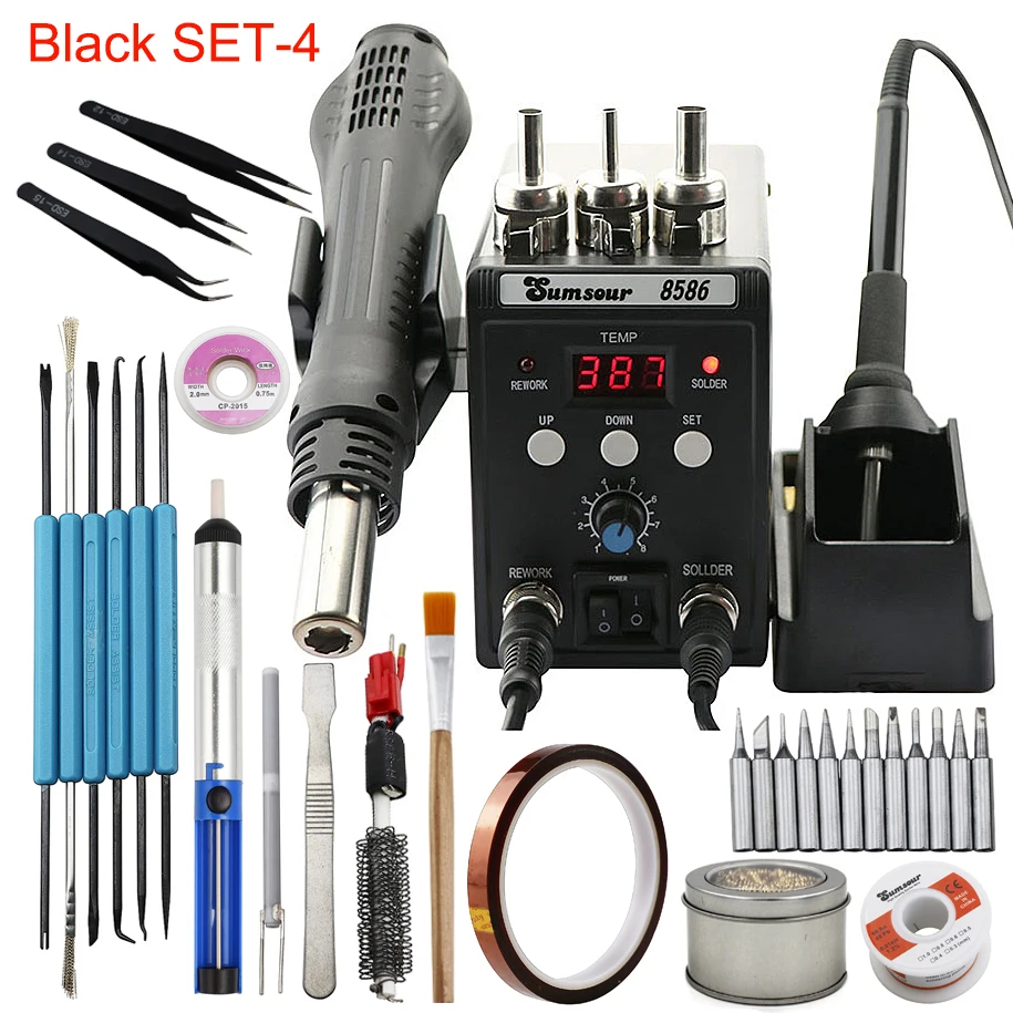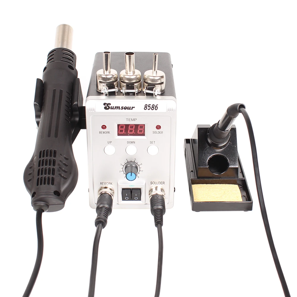 Это совершенно новая паяльная станция SMD 2 в 1 8586. Металлический корпус из сплава с высококачественным силиконовым корпусом отличается элегантным внешним видом и энергосбережением. Вы можете использовать Термофен и паяльник отдельно, без помех друг другу.