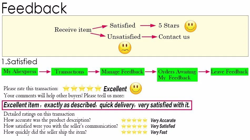 1. Если вы удовлетворены нашими продуктами и услугами, пожалуйста, оставьте свой положительный отзыв и 5 звезд. Положительный (5 звезд) очень важен для нас, пожалуйста, подумайте дважды, прежде чем оставить нам отзыв. 2. Если вы не удовлетворены нашей продукцией, пожалуйста, не стесняйтесь связаться с нами, прежде чем оставить отрицательный (1-3 звезды) отзыв или сделать подробную оценку. Мы сделаем все возможное, чтобы решить вашу проблему.
