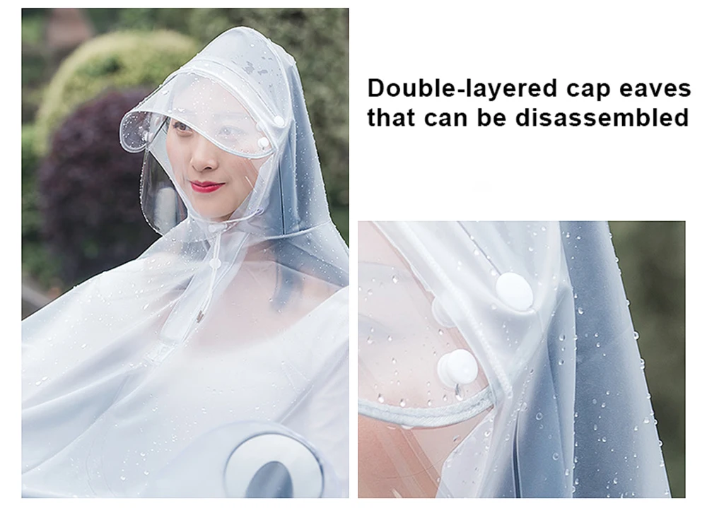 С капюшоном, сконструированным с двухслойными полями, с завязками на шее, фиксированными 2 кнопками, может защитить вас от дождя.
