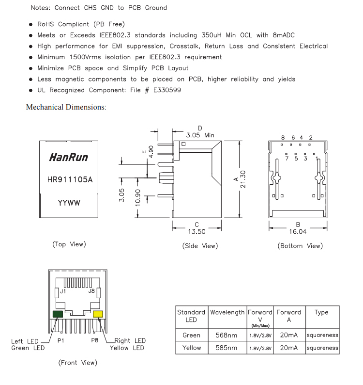 HR911105A RJ45 разъем RJ45 гнездо PCB монтажный сетевой адаптер для передачи данных сети с лампой