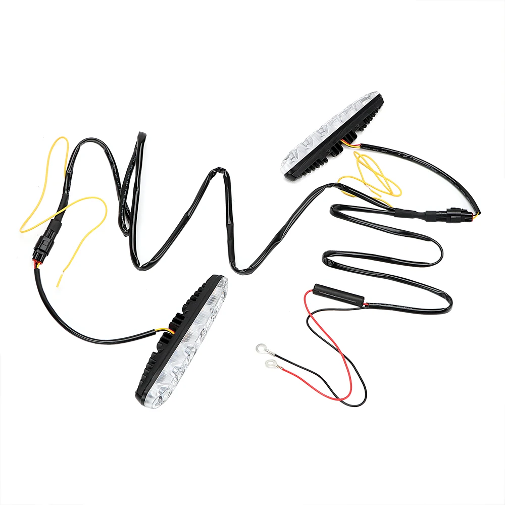 Цвет: черный корпус Материал: PPC + алюминиевый сплав Тип источника излучения: Светодиодная лампа Всего Излучателей: 6 шт. Цвет света: белый или Янтарный Входное напряжение: 12 В постоянного тока Цветовая температура: 6000 K Тип разъема: Соединительный кабель Состоит из трех линз ближнего света, трех линз дальнего света. Применение: дневные ходовые огни, указатель поворота Повысить безопасность вождения Во избежание дорожно-транспортных происшествий Защита от влаги Когда автомобиль повернет, свет изменится на Янтарный