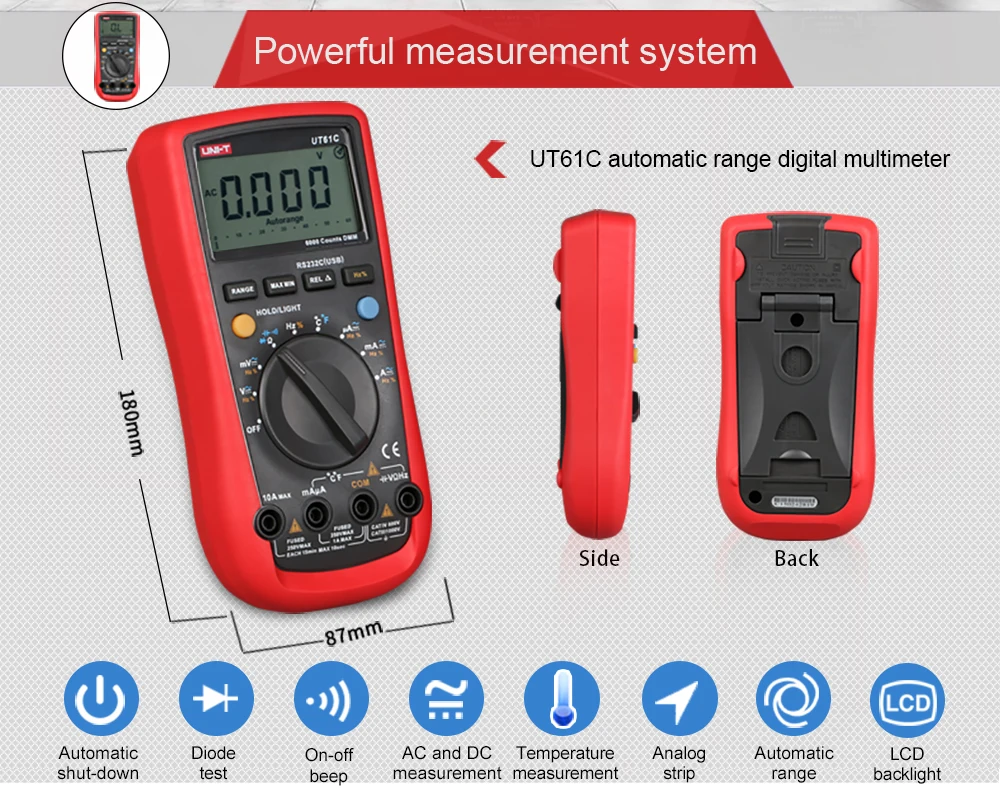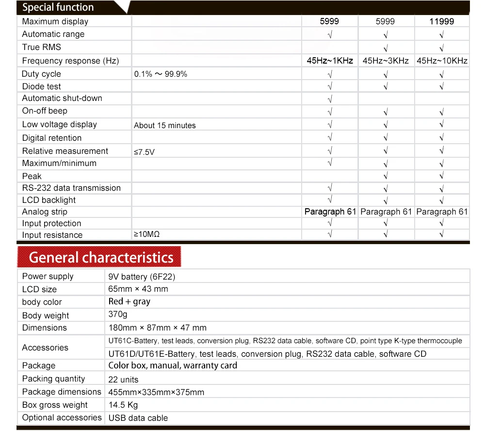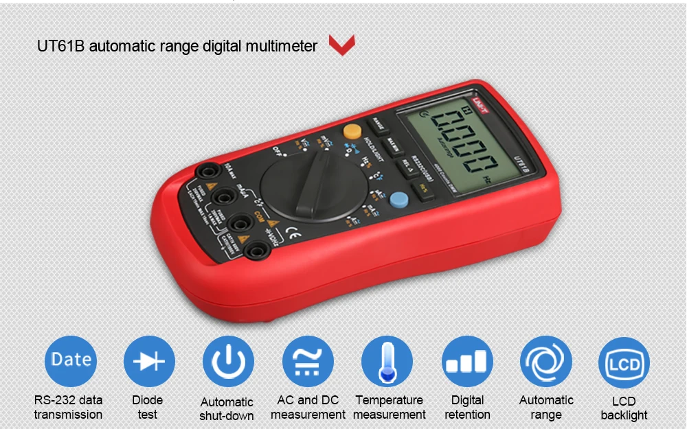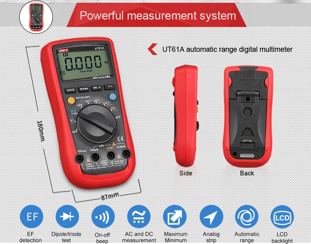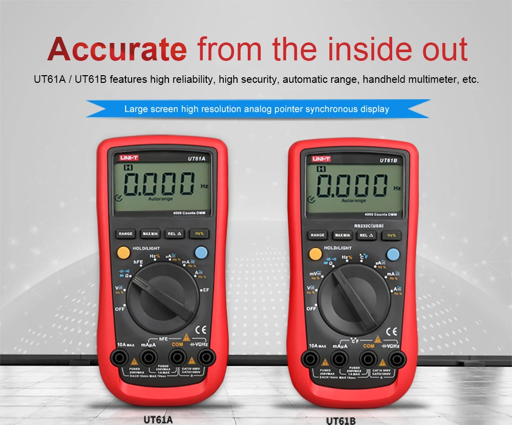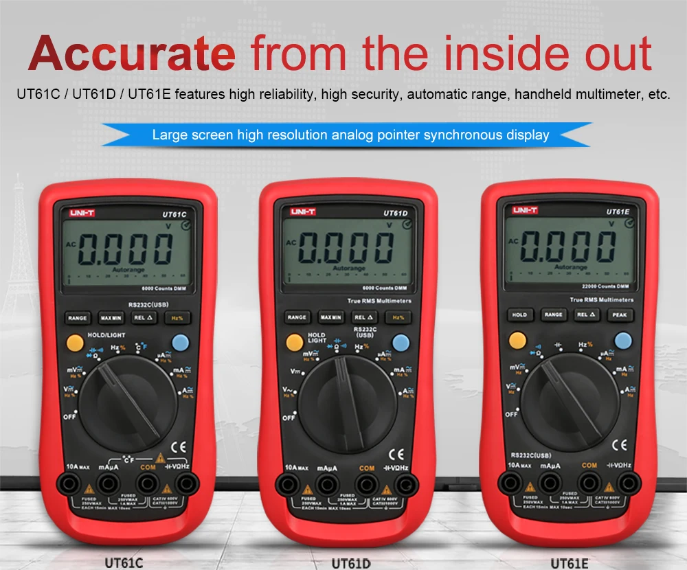 Серия UT61 соответствует стандартам CE, ETL и GS. Эта серия представляет собой Автоматический диапазон с возможностью выбора истинных моделей RMS (UT61D/E). Эта серия имеет множество функций и сочетается с высокой степенью безопасности CAT IV 600V. Подходит для современных электронных и электрических пользователей. Особенности: 1. Автоматический выбор диапазона измерения 2. Макс/мин/режим REL 3. Автоматическое выключение питания 4. ЖК-дисплей подсветка 5. RS-232 и usb-интерфейс 6. Аналоговый бар 7. NCV (UT61A) 8. Индикация низкого заряда батареи 9. True RMS 10. Диод/Непрерывный зуммер 11. Удержания данных 12. Защита входа