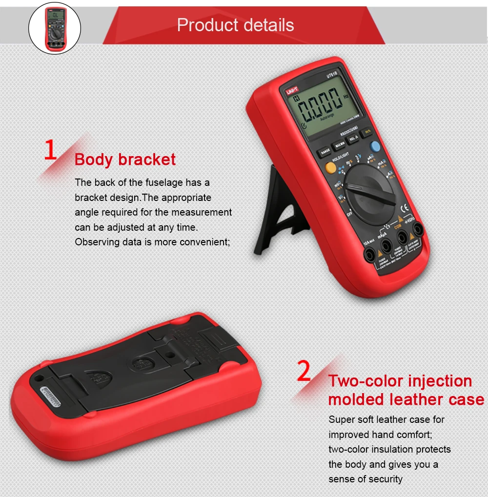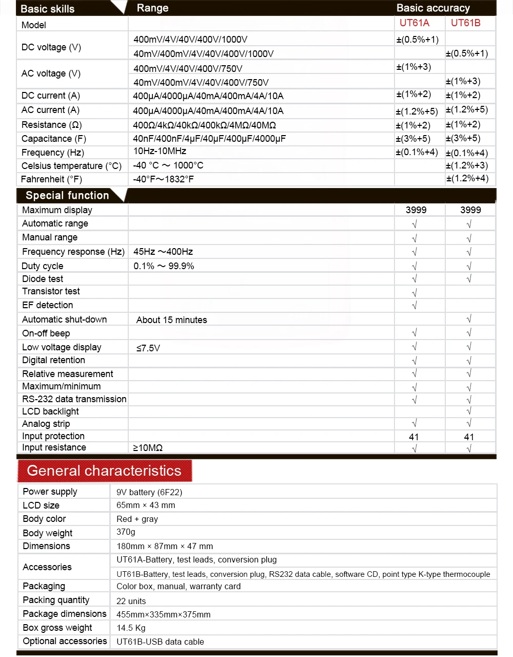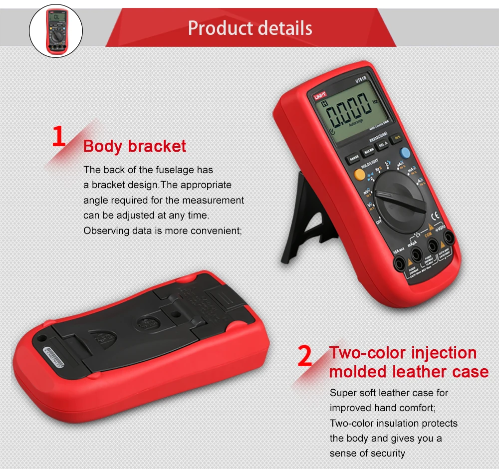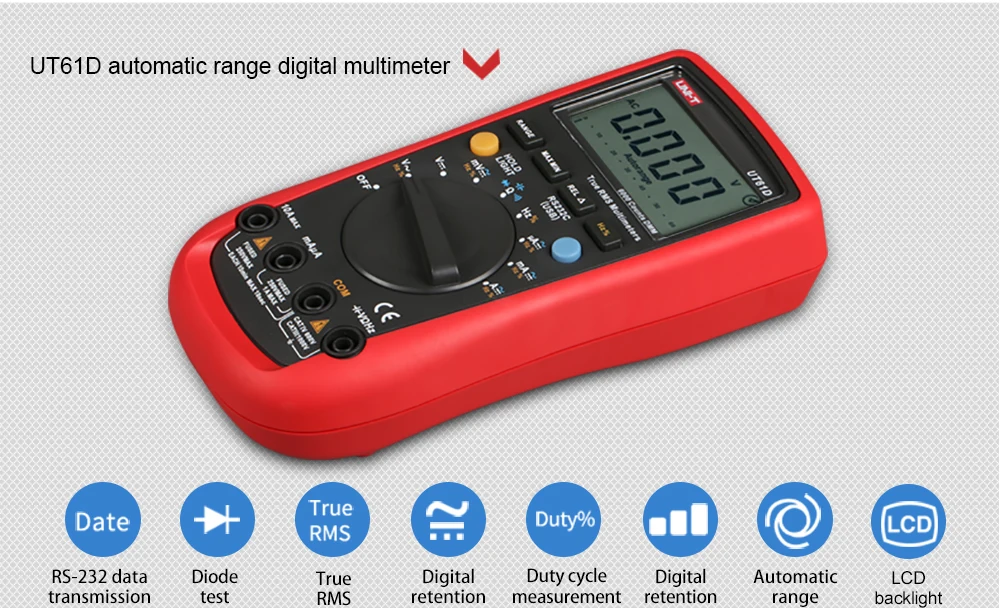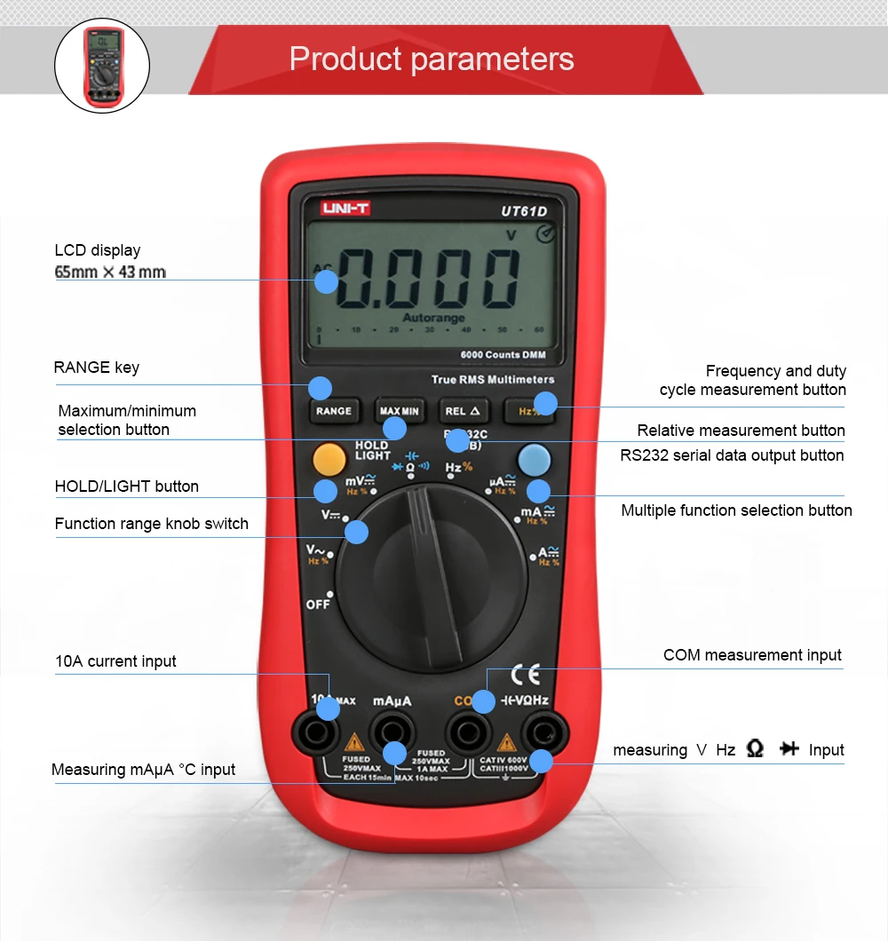 Серия UT61 соответствует стандартам CE, ETL и GS. Эта серия представляет собой Автоматический диапазон с возможностью выбора истинных моделей RMS (UT61D/E). Эта серия имеет множество функций и сочетается с высокой степенью безопасности CAT IV 600V. Подходит для современных электронных и электрических пользователей. Особенности: 1. Автоматический выбор диапазона измерения 2. Макс/мин/режим REL 3. Автоматическое выключение питания 4. ЖК-дисплей подсветка 5. RS-232 и usb-интерфейс 6. Аналоговый бар 7. NCV (UT61A) 8. Индикация низкого заряда батареи 9. True RMS 10. Диод/Непрерывный зуммер 11. Удержания данных 12. Защита входа