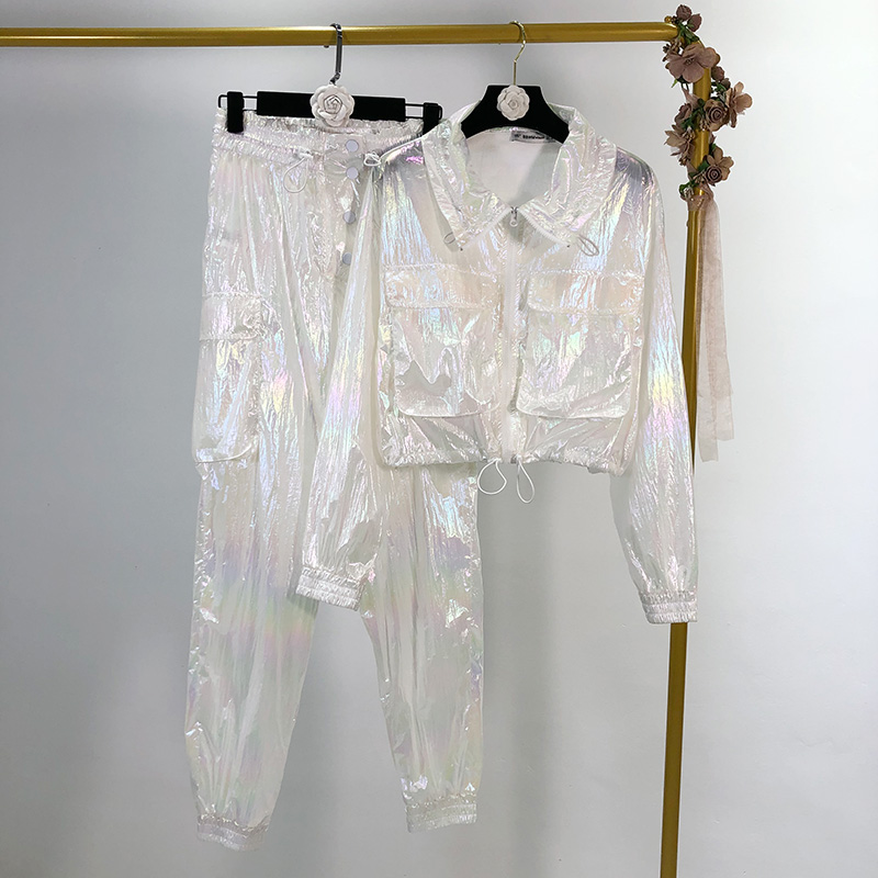 Женский спортивный костюм, комплект из двух предметов, кардиган на молнии, укороченный бомбер + длинные штаны, комплект из 2 предметов с лазером