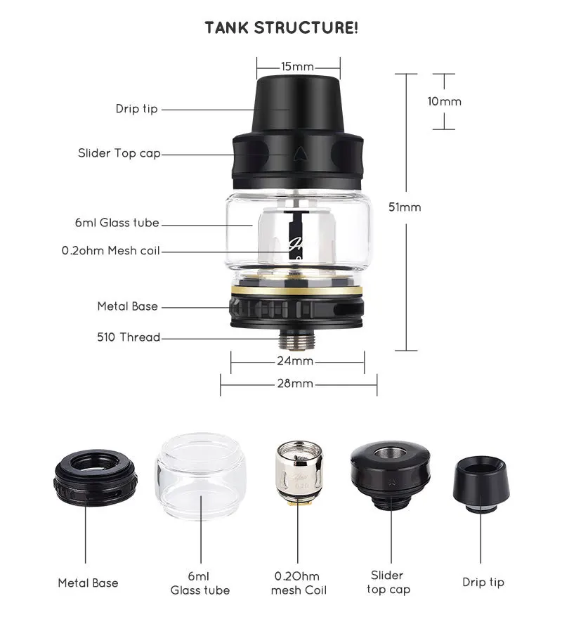 Характеристики бака поездки Материал: нержавеющая сталь 304 Диаметр: 24 мм Высота: 51 мм Емкость электронной жидкости: 2-6 мл тип резьбы: 510 нить посылка: Вариант 1: комплект бака для путешествий 2 мл 1 бак для путешествий 2 мл 1 дополнительная катушка (0,2 Ом) 1 дополнительное Стекло 6 мл 2 Резина 1 Руководство пользователя Вариант 2: Туда и обратно на бретелях только в том случае, 6 мл (1 шт.); Туда и обратно танк 6 мл (0,2 Ом) 1x бумажная коробка демонстрация изображений: