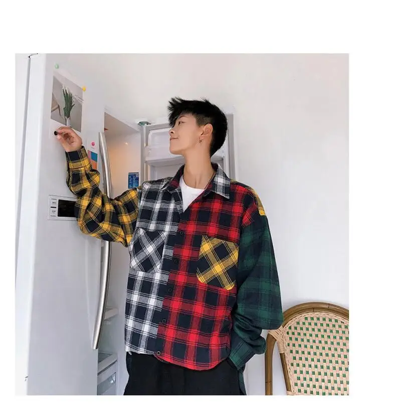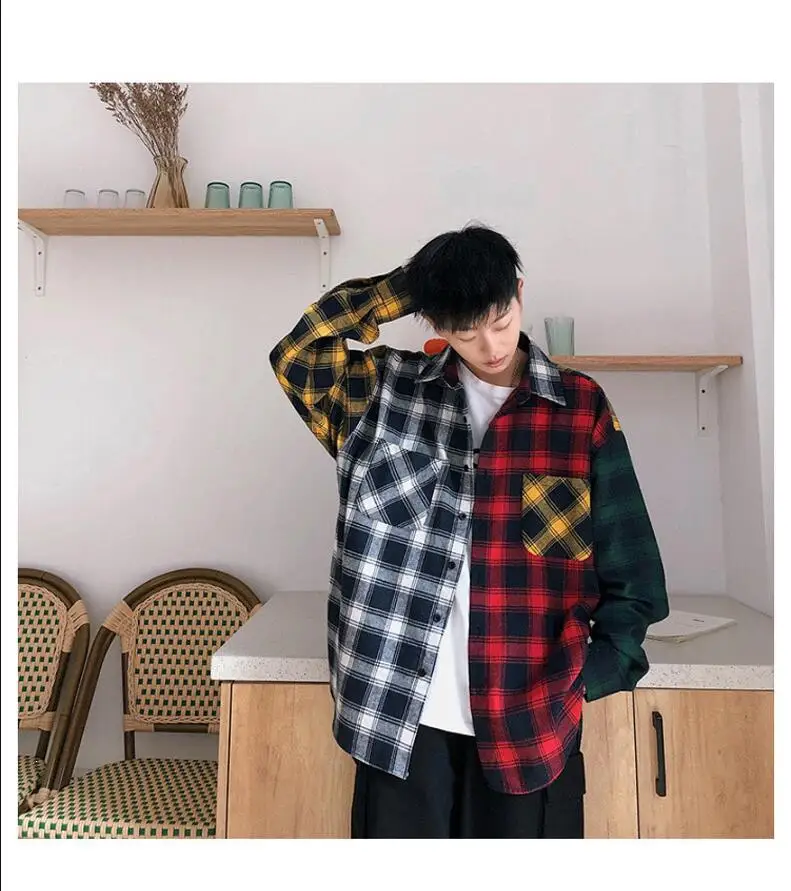 Осенняя Корейская версия, трендовые клетчатые цветные рубашки, мужские Асимметричные повседневные свободные хип-хоп мужские рубашки с длинным рукавом, уличная одежда