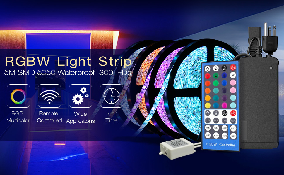 rgbw Easy Installation. Plug and play without wiring. Safe to use. The working voltage is 12V. extremely low heat. It is touchable and safe to children. Super brightness Waterproof IP65 RGBW LED strip Flexible operations. Slim, compact and flexible PCB strip. Mount end-to-end for bendable or angled patterns, or in continuous rows. Reduce re-lamp frequency. Lifespan is over 50000 hrs. Save effort and maintenance costs on changing lights frequently.