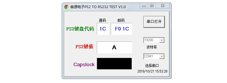 PS2 к RS232 Плата Поддержка тестового программного обеспечения может отображать 26 Английских алфавитных клавиш, таких как A--Z (корпус изменен CAPSLOCK) и соответствующий код клавиатуры, который может отображать 0-9 значение ключа и код клавиатуры, и другие функциональные клавиши только дисплей клавиатура код не отображает значение ключа.