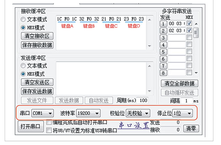 Плата преобразуется в данные, полученные последовательным портом. (В качестве демонстрации проверяются только четыре клавиши a B C D клавиатуры, а другие могут соответствовать приведенной выше таблице)